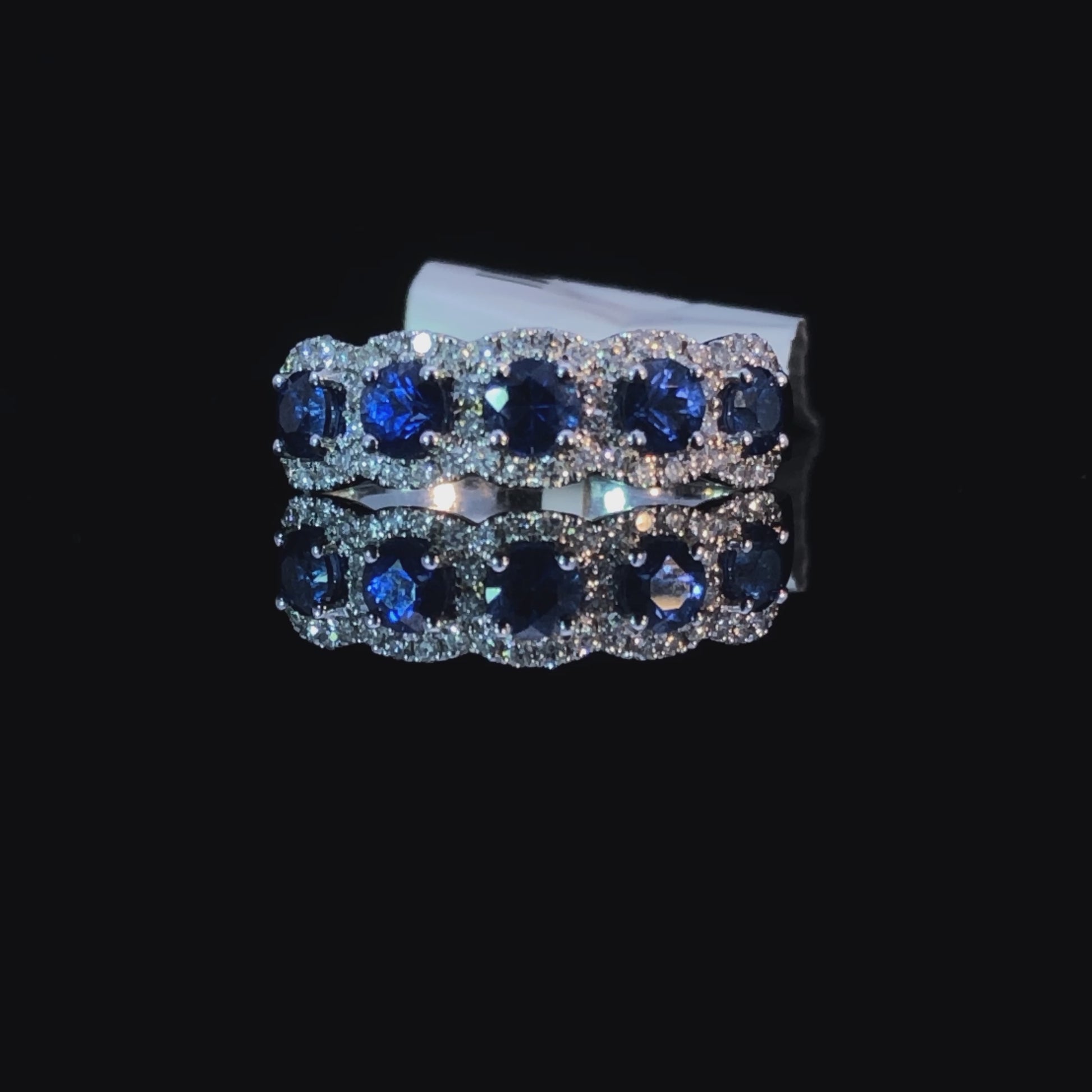 This 14 kt white gold ring is a luxurious show-stopper! Intricately adorned with luminous sapphires, delicately embellished with halos of sparkling diamonds for an extra sparkle—you'll love the .82 ctw of sapphires, plus .24 ctw of diamonds. Make a statement with this beautiful piece! This ring is a size 6.75. If that size is not a perfect fit, first time sizing is free at the time of purchase. Additional sizing fees may apply.