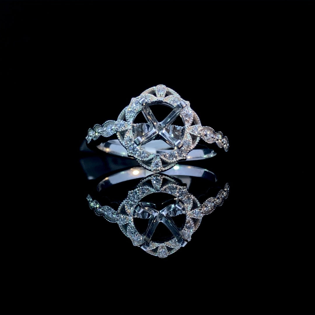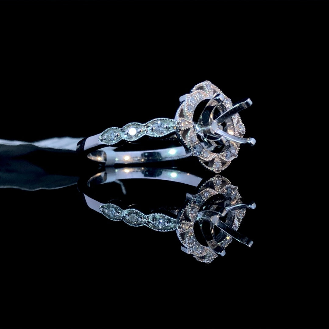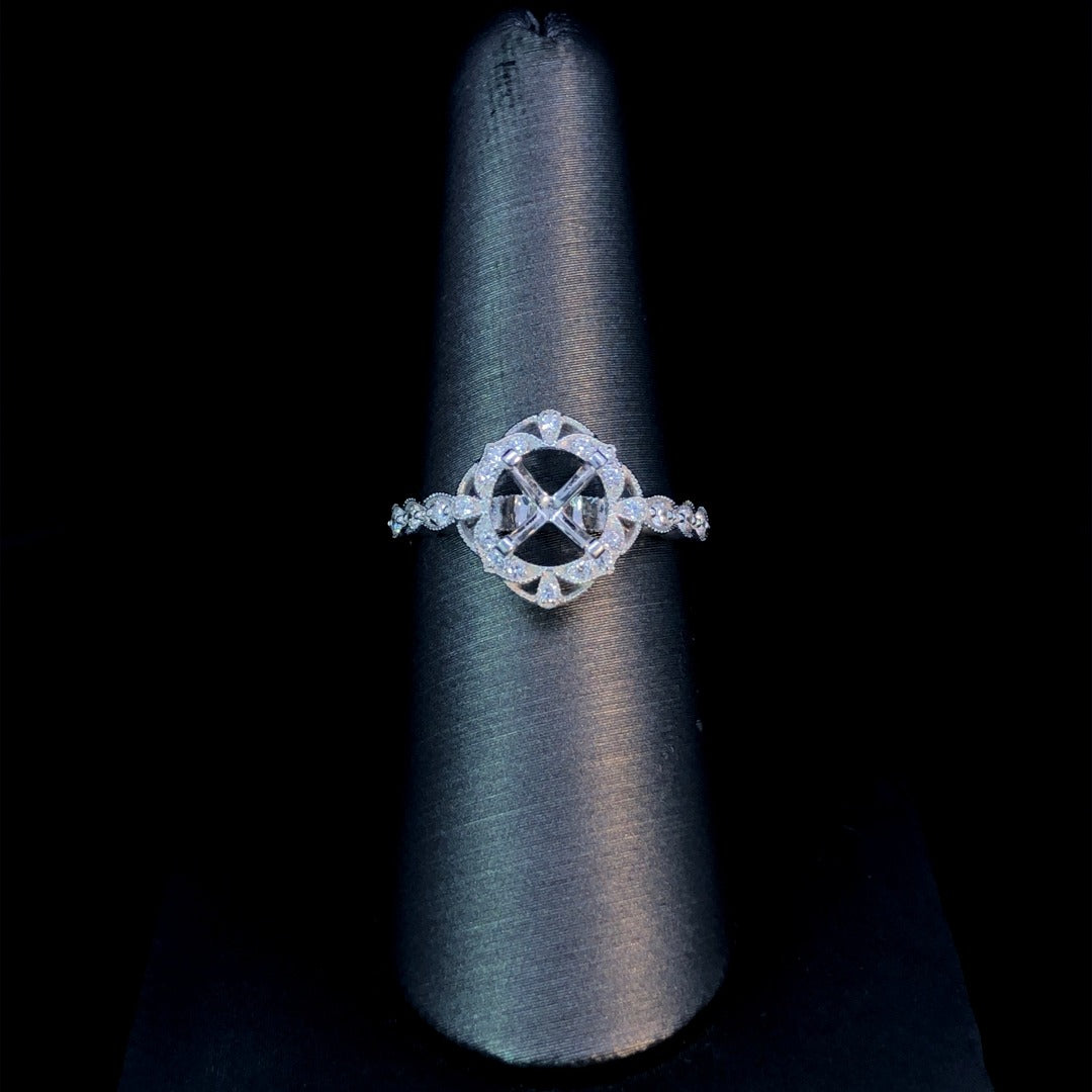 Looking for the perfect ring? Look no further! Our stunning diamond semi mount has a unique halo filigree design with .25ctw of round diamonds set in 14kt white gold, and allows you to choose your own center stone from our wide selection of loose stones. Make this ring truly your own. Price is for the semi mount only. Center stone will be added at an additional cost. This ring is a size 7.25. If that size is not a perfect fit, first time sizing is free at the time of purchase. Additional sizing fees may apply.