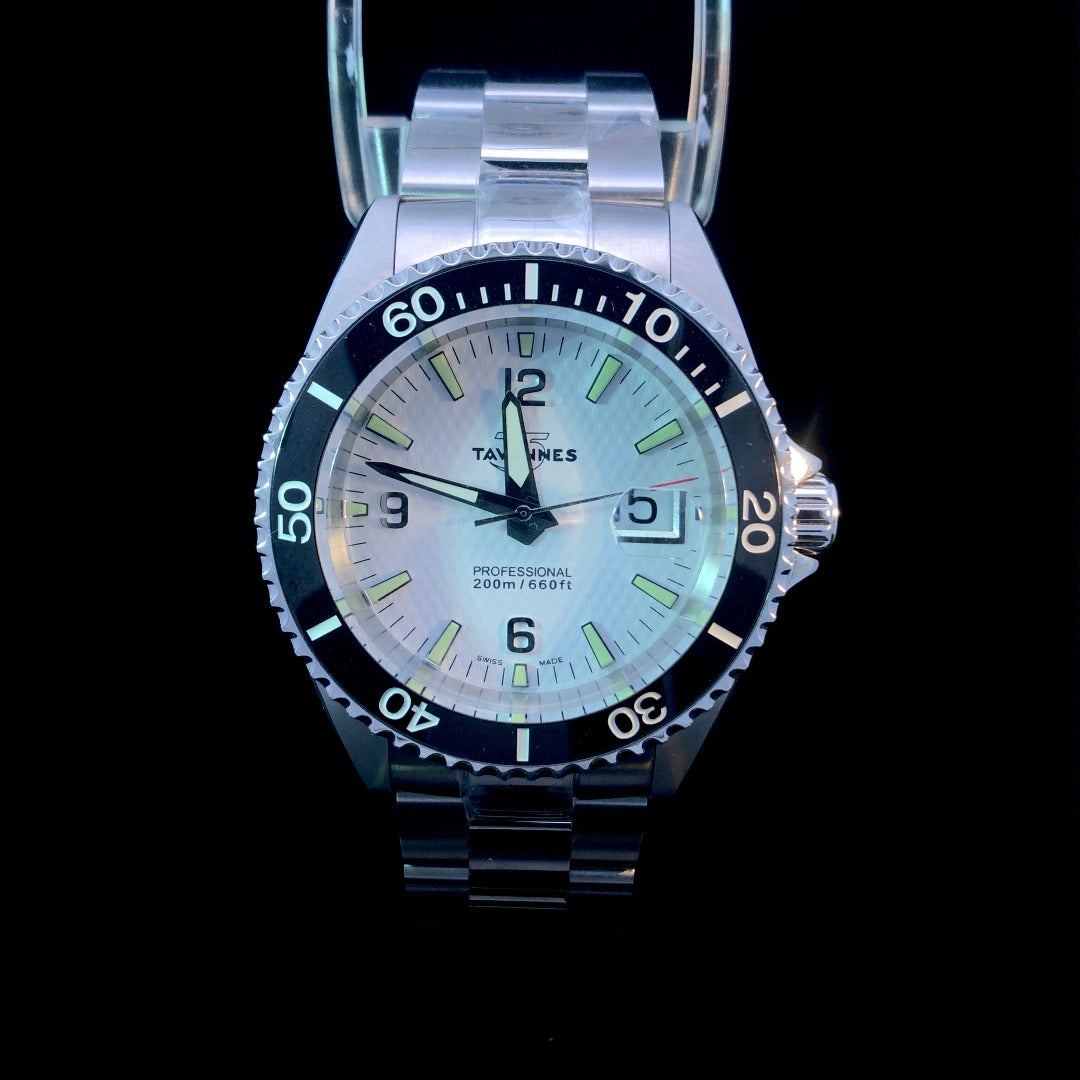 This men's Tavannes Ocean Edge Steel Driver is a perfect companion for any occasion. Its exquisite ceramic bezel, timeless white face, and luminous hands and markings make it the ideal choice for the modern wearer. Crafted to the highest standards, it exudes sophistication and luxury.