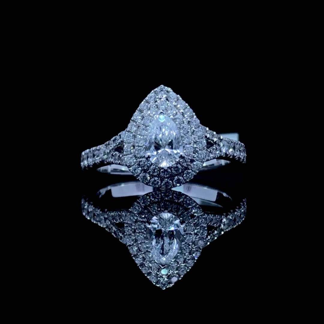 This stunning .93 ctw pear shaped diamond ring is crafted from 14 kt white gold. A .33 ct pear shaped diamond is mounted into a dazzling diamond halo, with an additional .60 ctw of diamonds for a total carat weight of .93 ctw. A classic yet elegant piece, this ring is sure to make a statement. Ring is a size 6.75 and can be sized at the time of purchase for the first time for free. Additional sizing fees may apply.