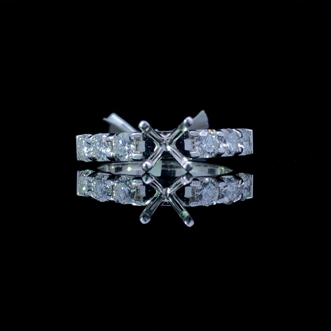 This stunning 14kt white gold diamond semi mount is the perfect way to frame a center stone of your choice. Delightful round diamonds totaling .72ctw grace the band, making this piece truly breathtaking. Make it your own! Price is for the semi mount only. Center stone will be added at an additional charge. This ring is a size 6. If that size is not a perfect fit, first time sizing is free at the time of purchase. Additional sizing fees may apply.