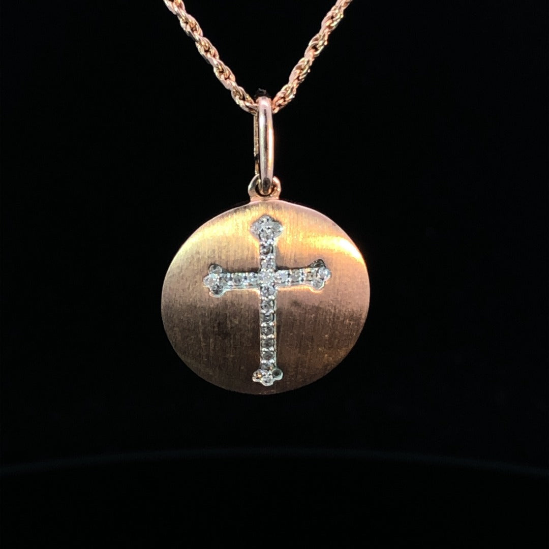 This elegant .10ctw round diamond cross on rose gold disc pendant makes a timeless statement. The diamonds are expertly set in a classic pattern that shines bright for years to come. The 14k rose gold is a blush hue that adds a feminine touch to any look. Chain is not included.