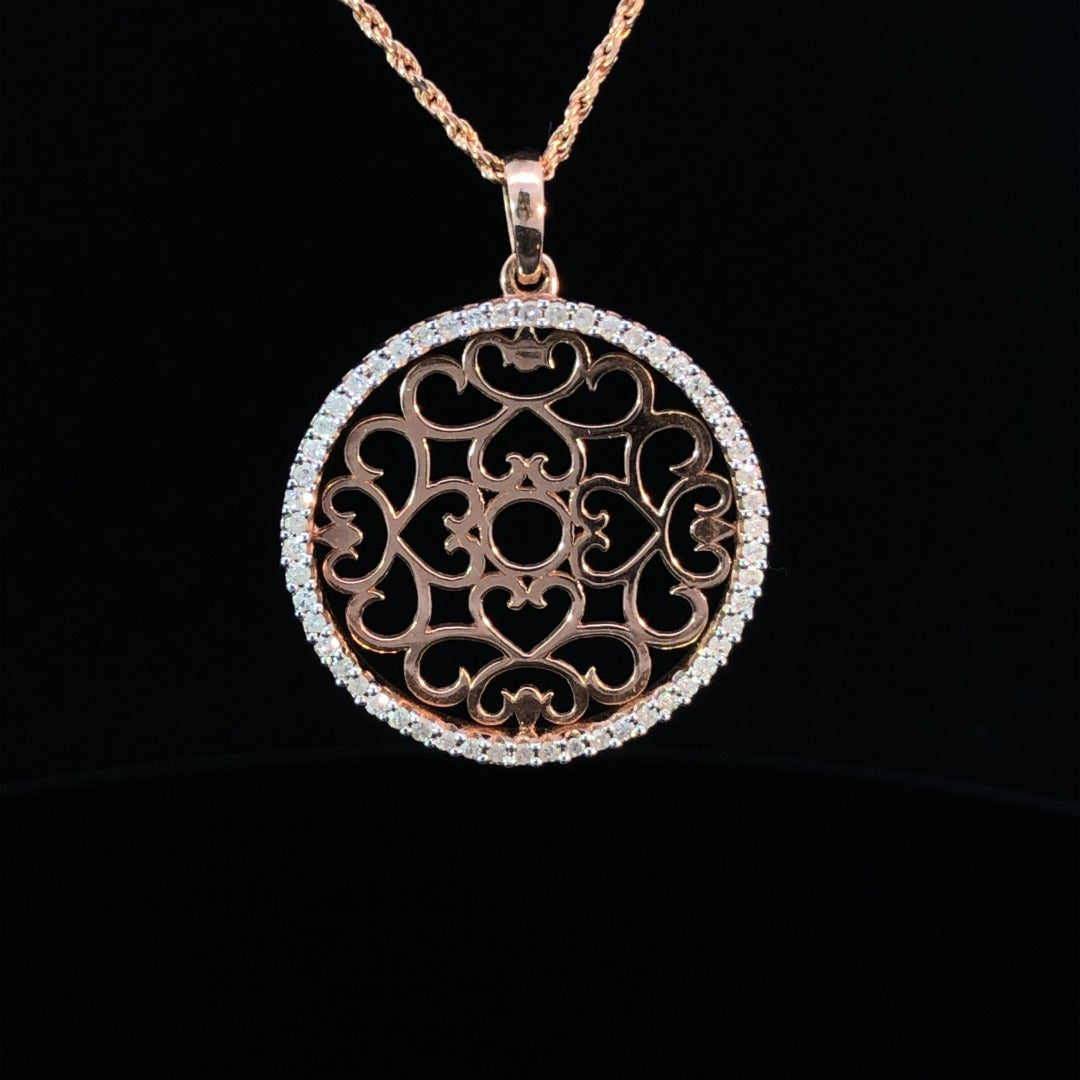 Make a bold style statement with this exquisite 14kt rose gold circle pendant. Adorned with elegant rose gold filigree, the pendant is further enhanced with .30ctw of brilliant diamonds on the outer circle, making it a truly eye-catching piece to own. Dare to be different and add some sparkle to your look! Chain is not included.