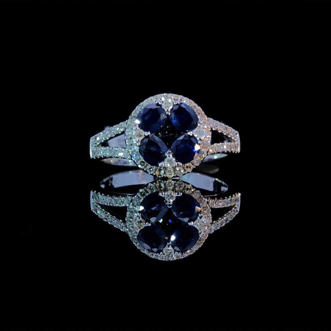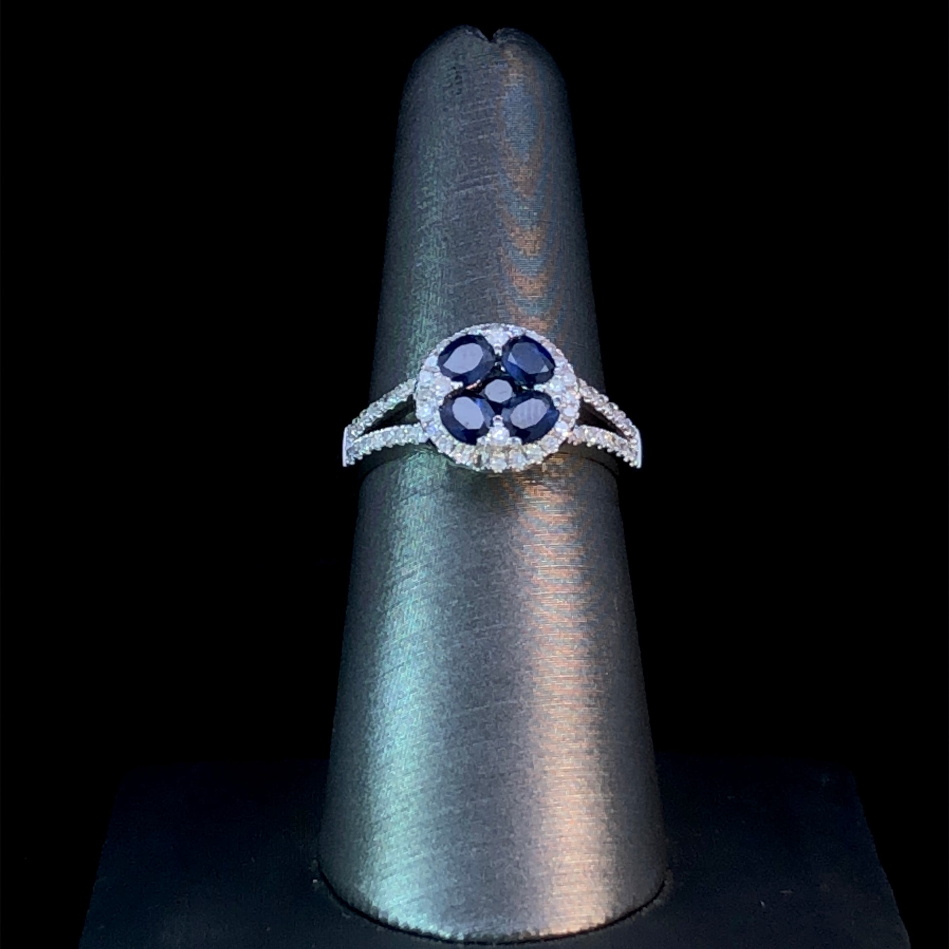 This exquisite gemstone and diamond ring is a timeless treasure. Crafted from 14kt white gold, the design features a stunning cluster of sapphires encircled by a sparkling diamond halo and delicately finished with a diamond split shank band. A refined and elegant piece for any special occasion. This ring is a size 7. If that size is not a perfect fit, first time sizing is free at the time of purchase.