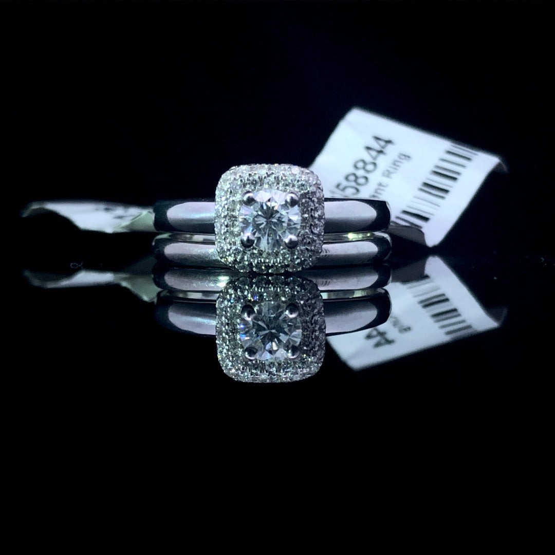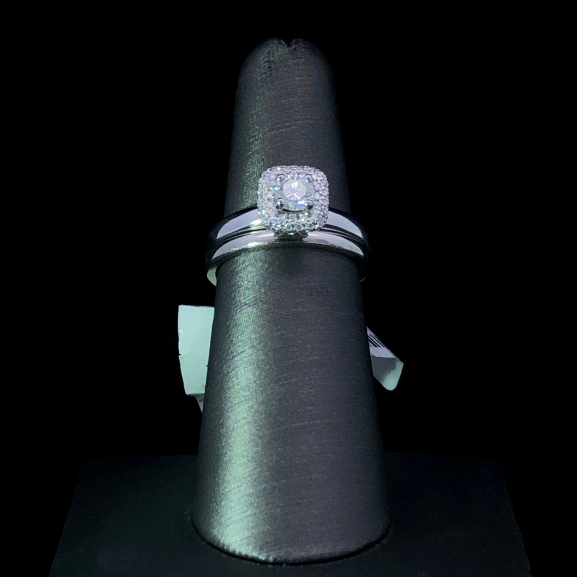 This ring stands out with its unique, modern design, making it the perfect statement piece to show off your individual style. Its luxurious appeal comes from the .34ct round diamond in the center, further enhanced by the halo of the .25ctw of round pave set diamonds in 14kt white gold. When paired with the matching plain white gold comfort fit band (priced separately), you will sparkle like never before. This ring is a size 6.25. If that size is not a perfect fit, first time sizing is free at the time of purchase. Additional sizing fees may apply.