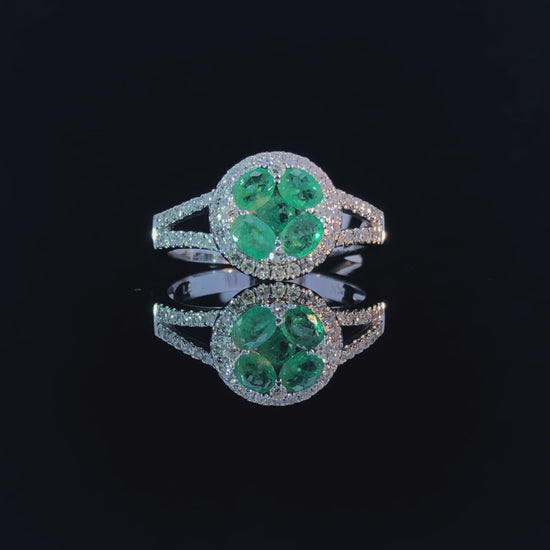 Let your style shine with this one-of-a-kind emerald and diamond cluster ring. Crafted in luxurious 14kt white gold, this ring features a sparkling halo of diamonds that surrounds five dazzling emeralds. An additional array of diamonds adorn the split shank band for a total weight of .33ctw of diamonds. A stunning display of brilliance! This ring is a size 7. If that size is not a perfect fit, first time sizing is free at the time of purchase. Additional sizing fees may apply.