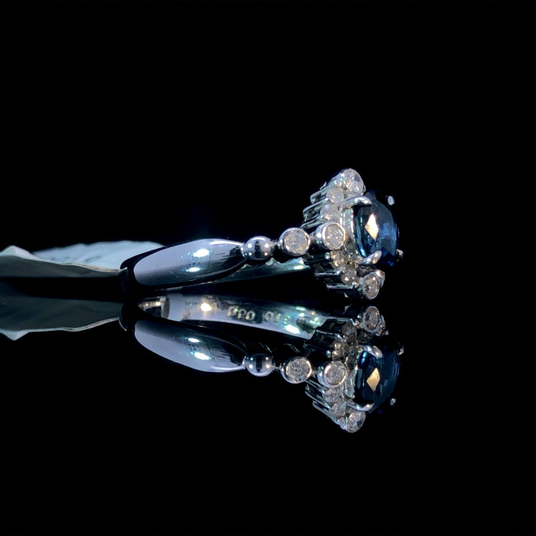 Enchant your look with this ring featuring a sparkling, .50 ct oval sapphire that is lovingly set in platinum with a diamond halo and diamond band of .18 ctw. This gem will add star-like brilliance to your ensemble. Feel beautiful and admired in this luminous piece of jewelry. This ring is a size 6.25. If that size is not a perfect fit, first time sizing is free at the time of purchase.