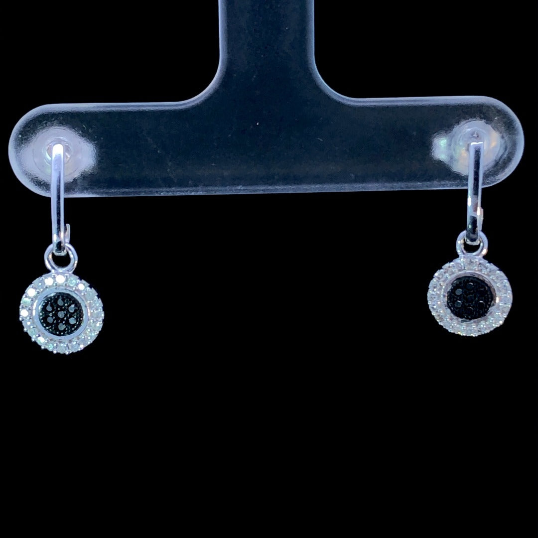 These beautiful earrings feature a cluster of black diamonds in the center, surrounded by a halo of white diamonds in 10kt white gold, for a total weight of .20ctw. Their intricate design adds an elegant touch to any special occasion or everyday look.
