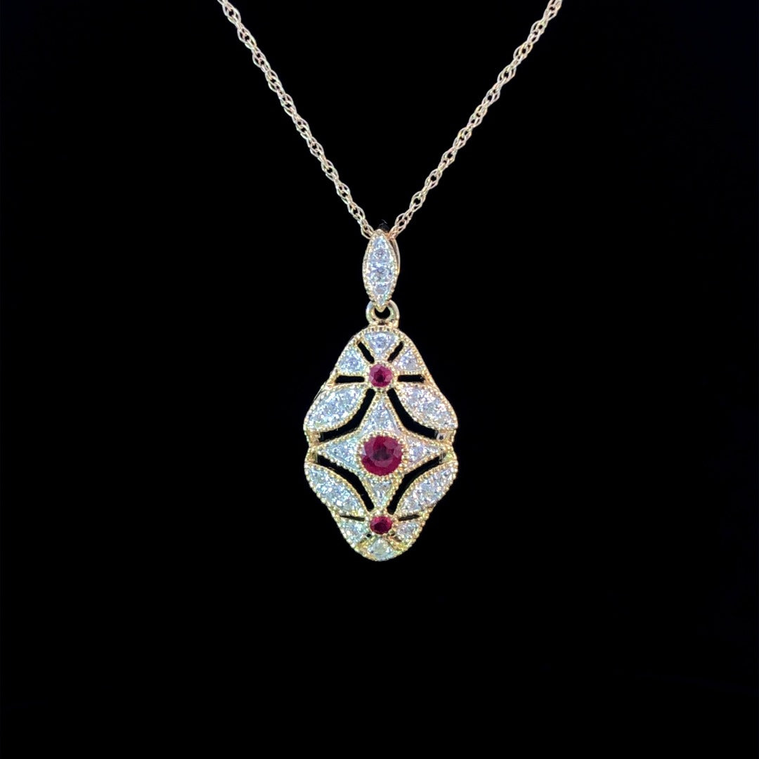 Experience pure elegance with this exquisite two-tone pendant, featuring delicately detailed rubies and diamonds skillfully set in 10kt gold. Exquisite rubies totaling .20ctw and shimmering diamonds totaling .12ctw will add a luxurious sparkle to any look. Unlock your glamorous side with this timeless piece! Chain is not included.