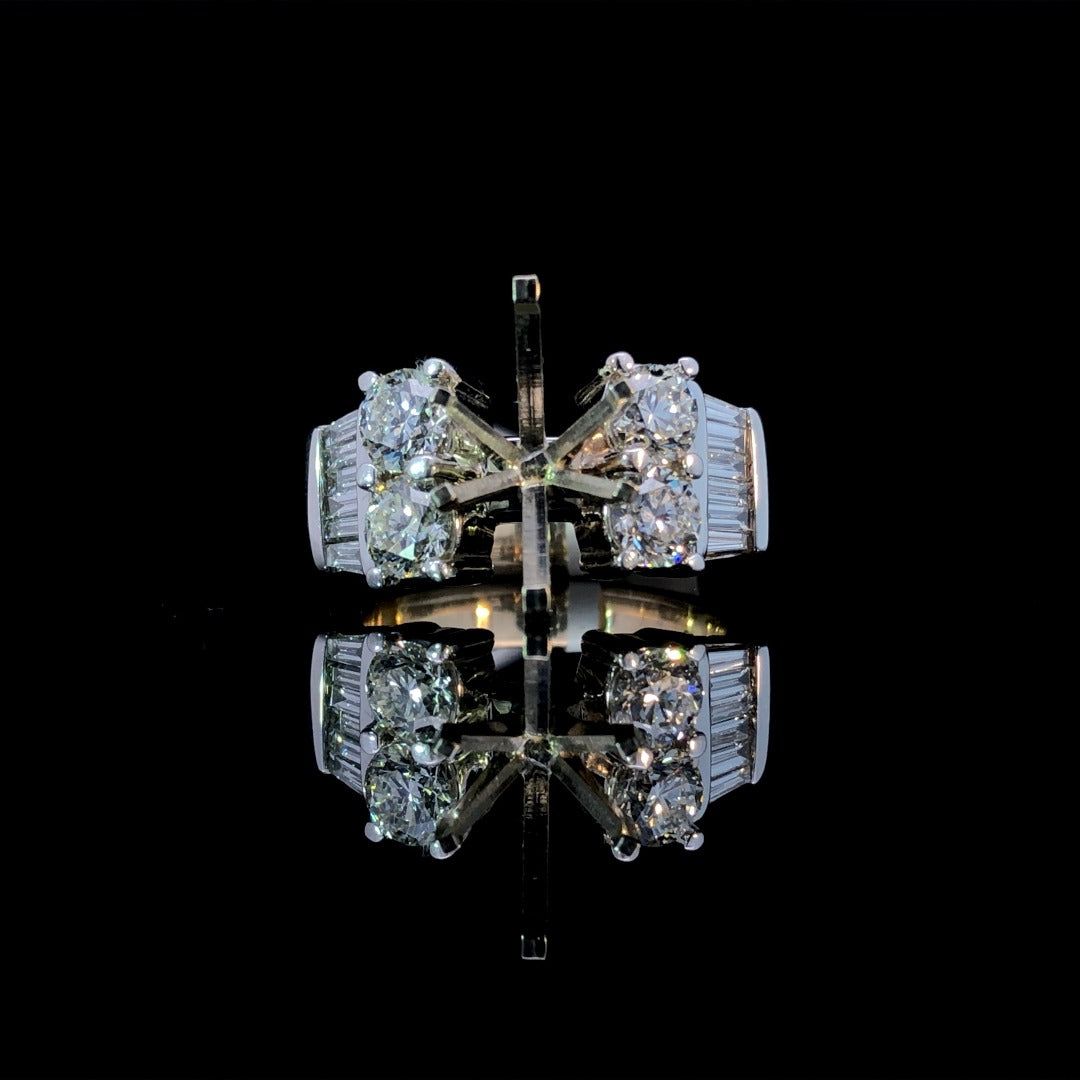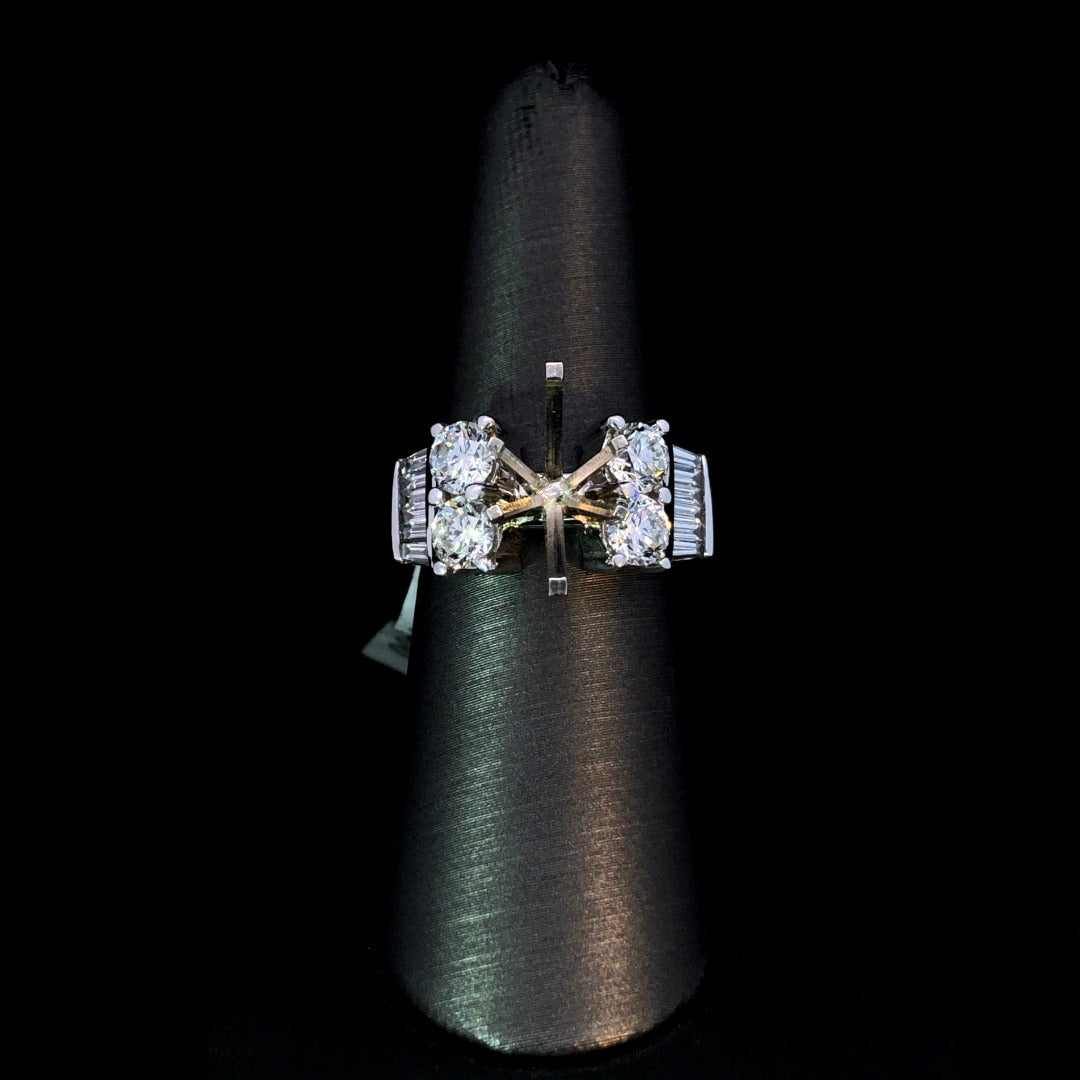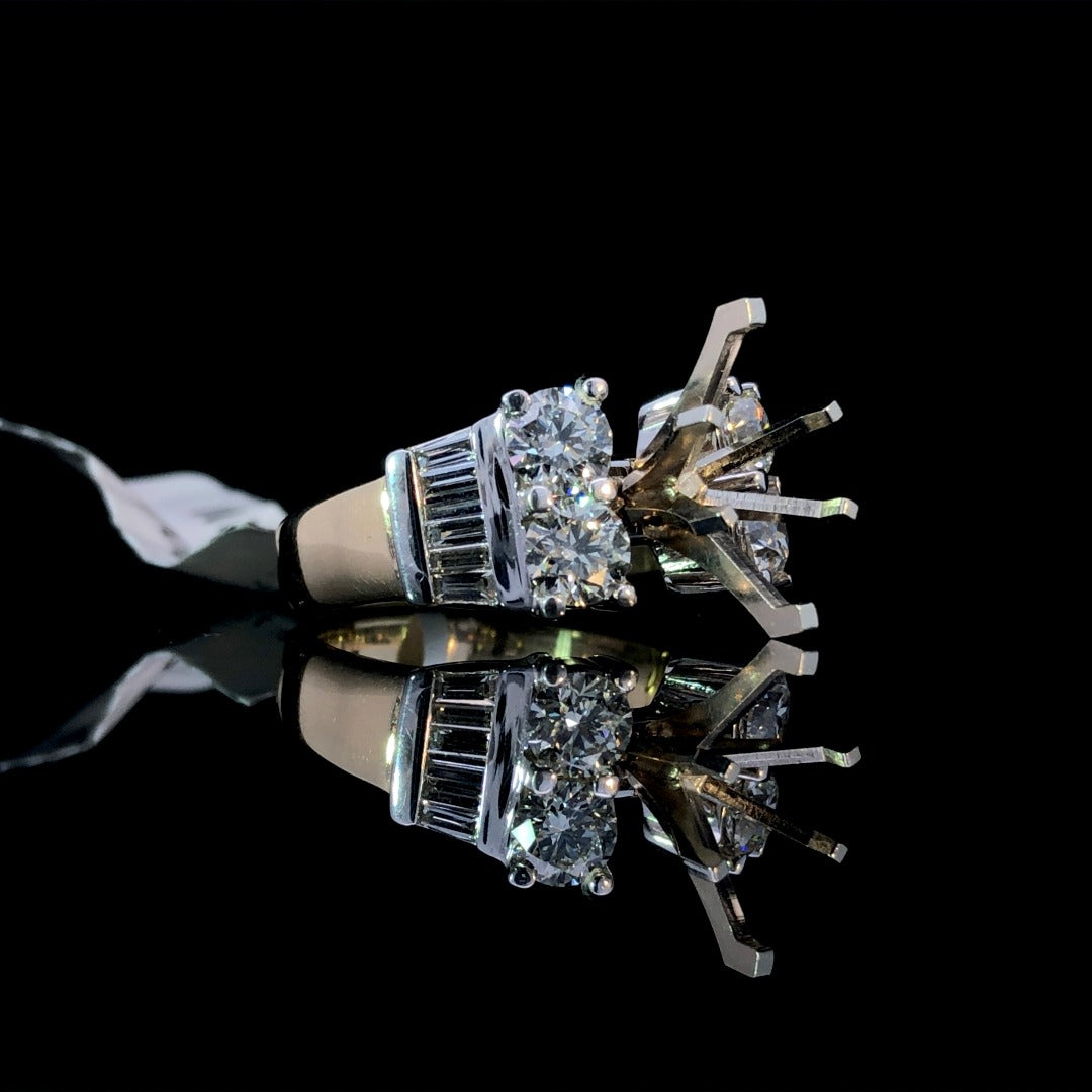 Indulge in the ultimate luxury with this gorgeous diamond semi mount. Boasting a 2-tone 14 karat gold design adorned with sparkling round and baguette diamonds totaling 2.44ctw, this piece radiates sophistication and exclusivity. Choose from our stunning selection of loose stones to complete your statement look. Price is for the semi mount only. Center stone will be added at an additional cost. This ring is a size 7. If that size is not a perfect fit, first time sizing is free at the time of purchase. Additional sizing fees may apply.
