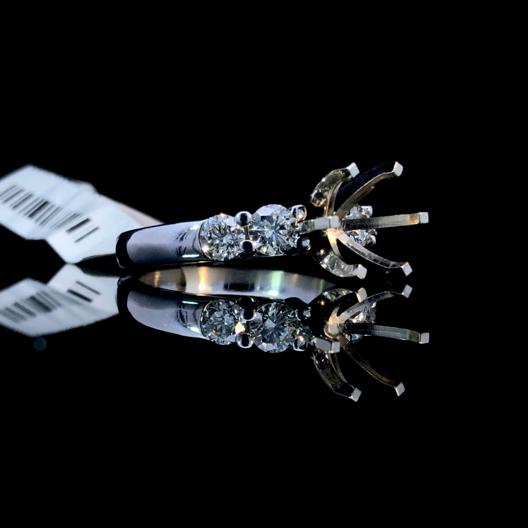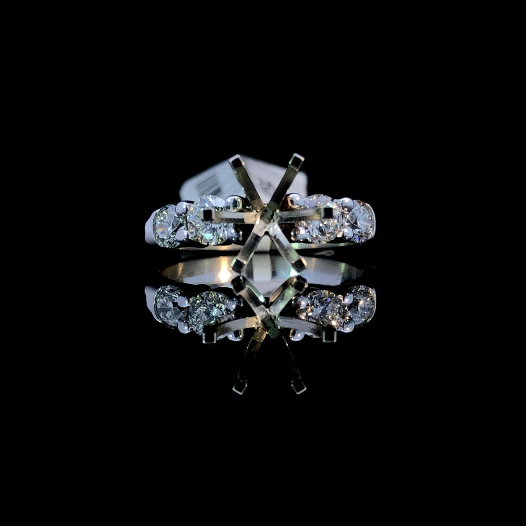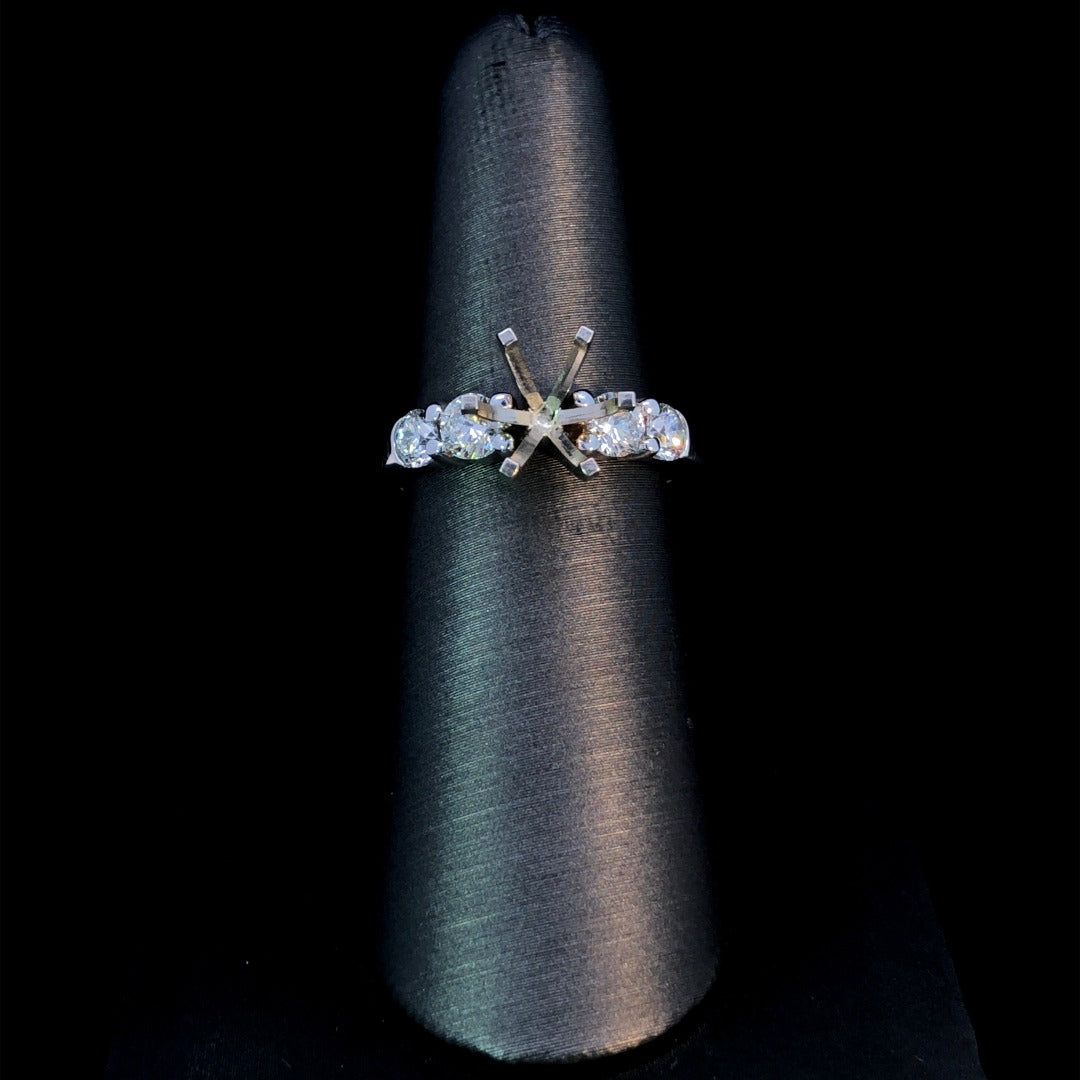 Indulge in luxury with our timeless diamond semi mount featuring four sparkling round diamonds (.84ctw) set in 14kt white gold. Choose your own center stone and let our skilled jewelers set and custom size it to perfection, usually within the day. Elevate your style with this elegant and exclusive piece. Price is for the semi mount only. Center stone will be added at an additional cost. This ring is a size 7. If that size is not a perfect fit, first time sizing is free at the time of purchase. Additional sizing fees may apply.