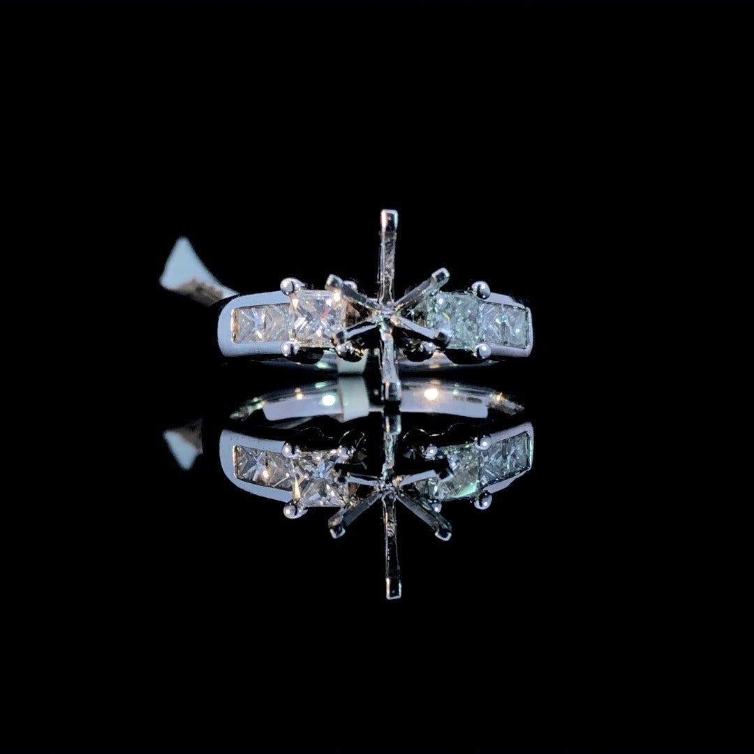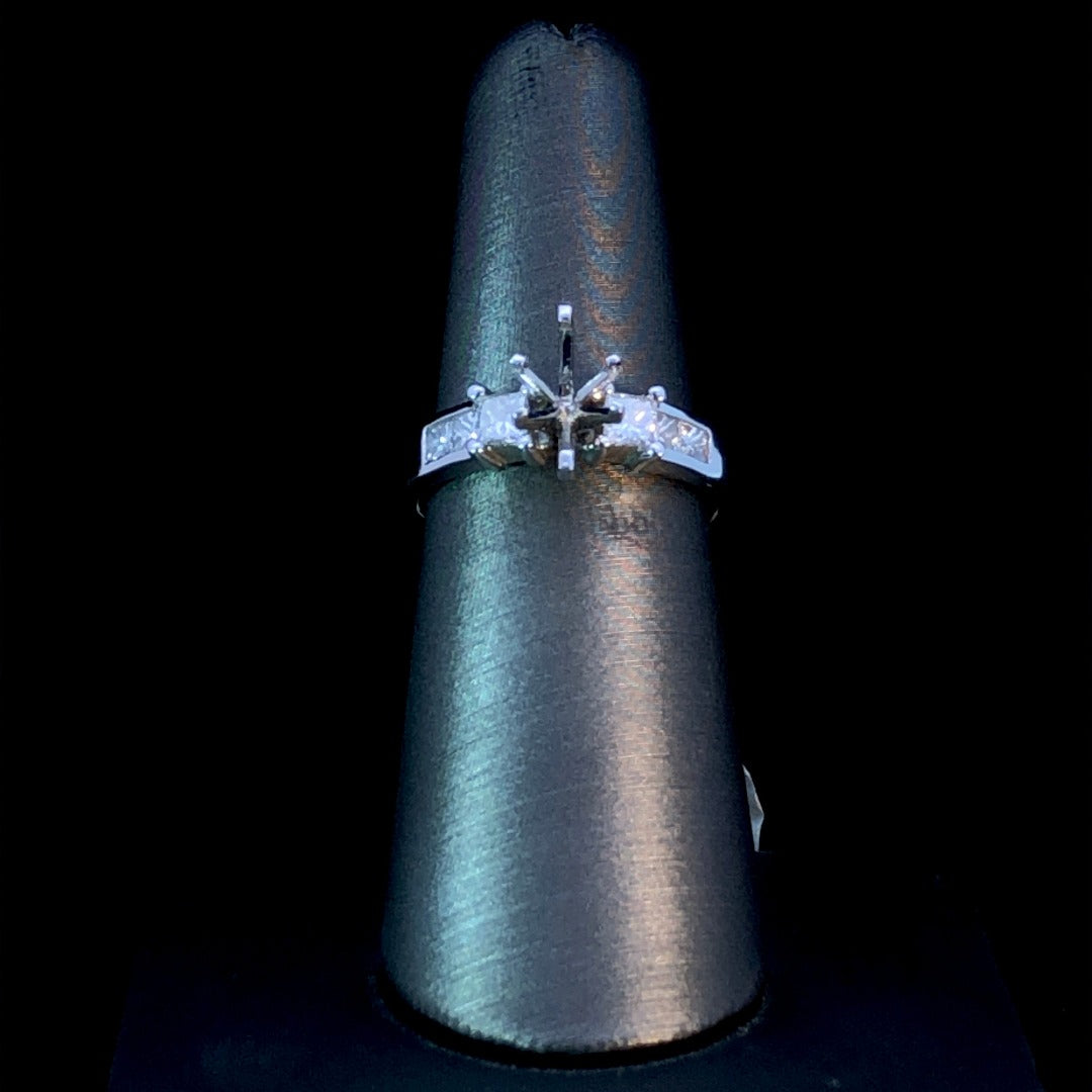 This luxurious 14kt white gold semi mount evokes the grandeur of a classic diamond setting, boasting a sparkling .70ctw of princess cut diamonds for added elegance. Create your own perfect piece with the center stone of your choosing, designed exclusively for you. Price is for semi mount only. Center stone will be added at an additional cost. This ring is a size 7. If that size is not a perfect fit, first time sizing is free at the time of purchase. Additional sizing fees may apply.