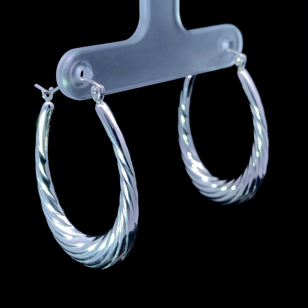 Striking and bold, these 14kt white gold earrings feature an oval shaped, textured twist design that is sure to draw attention. Their lightweight yet sturdy construction ensures maximum comfort and durability. Make a statement in the most beautiful way.