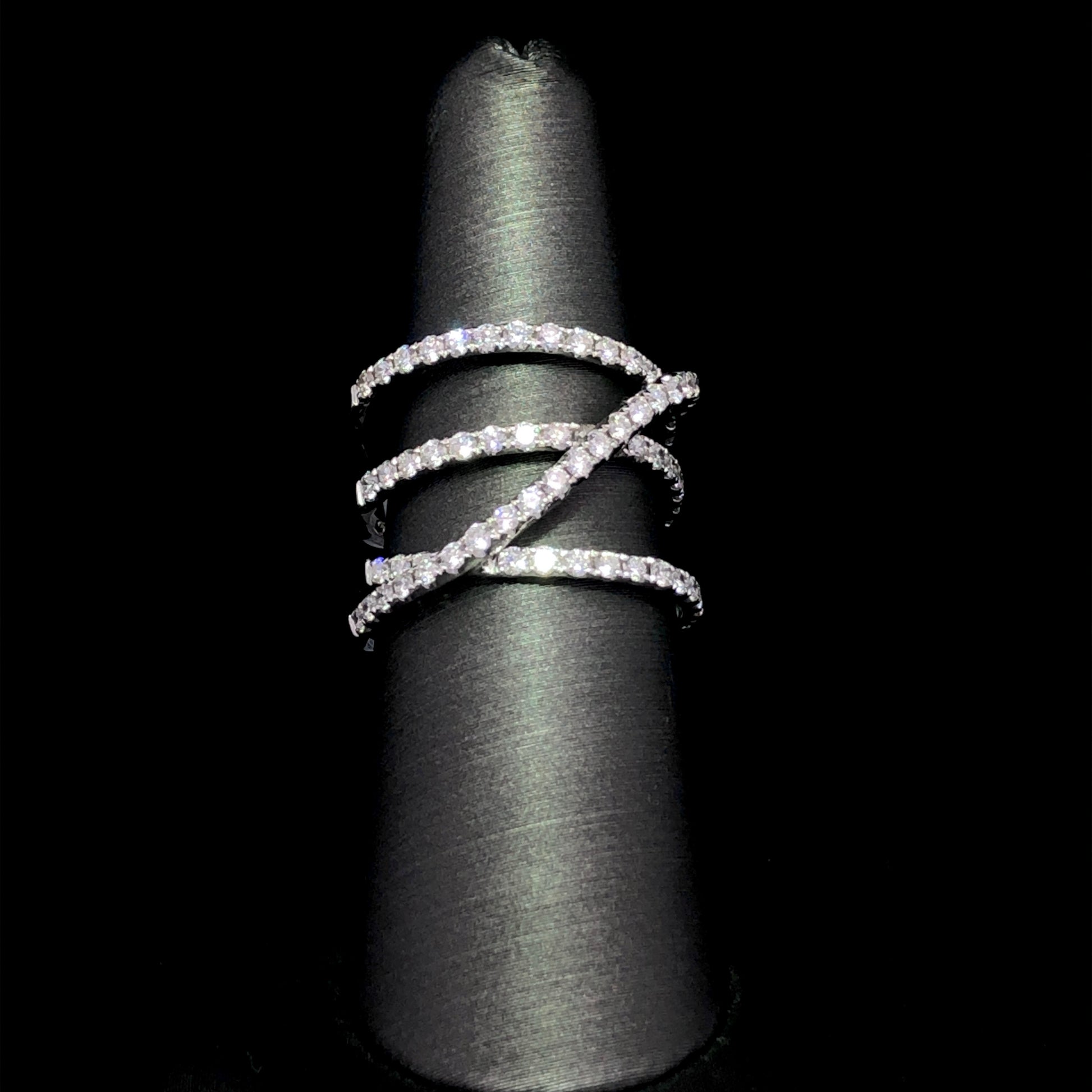 Adorn your finger with this stunning 14kt white gold wide band ring with 1.26ctw of round diamonds. The unique design with 1 row looping over the others will draw attention and admiration wherever you go. Get ready for the compliments! This ring is a size 7.25. If that size is not a perfect fit, first time sizing is free at the time of purchase. Additional sizing fees may apply.