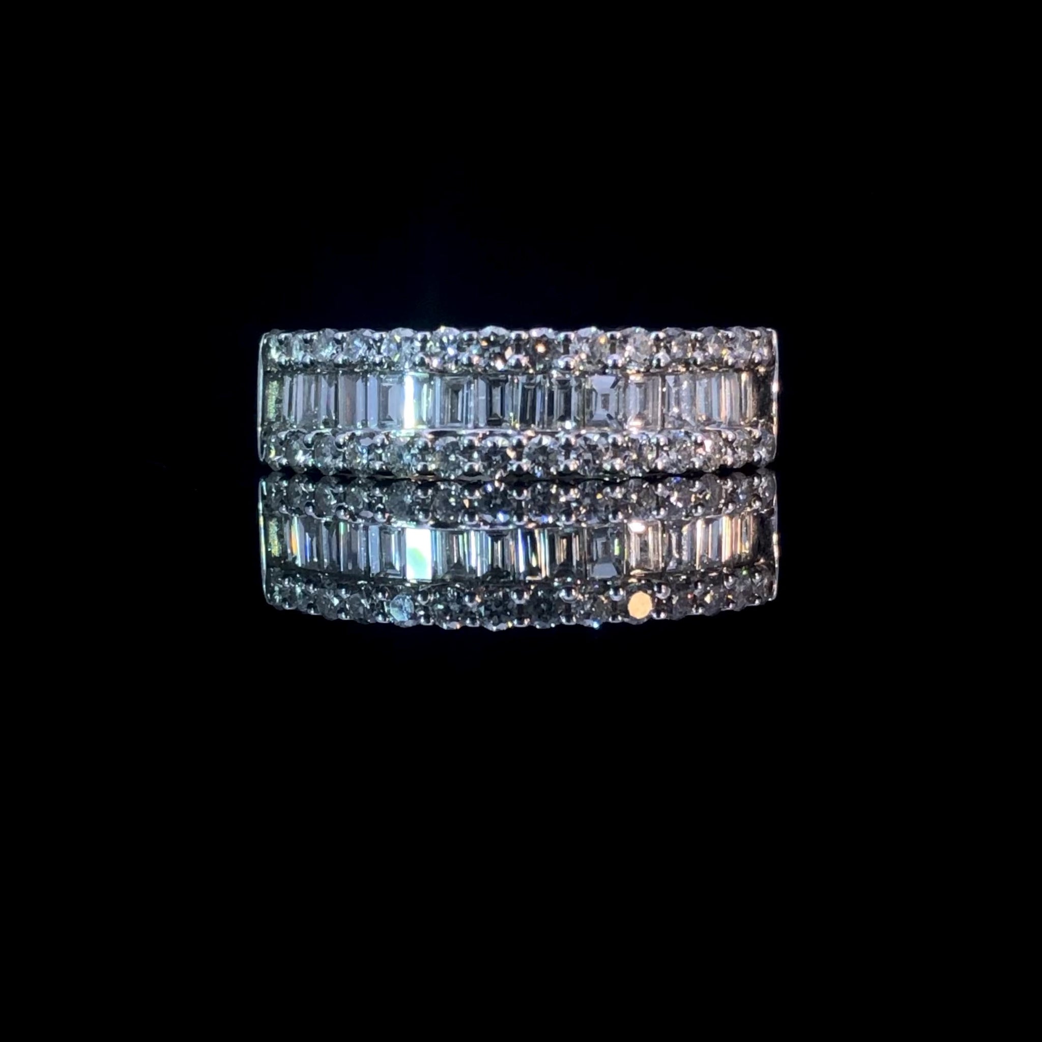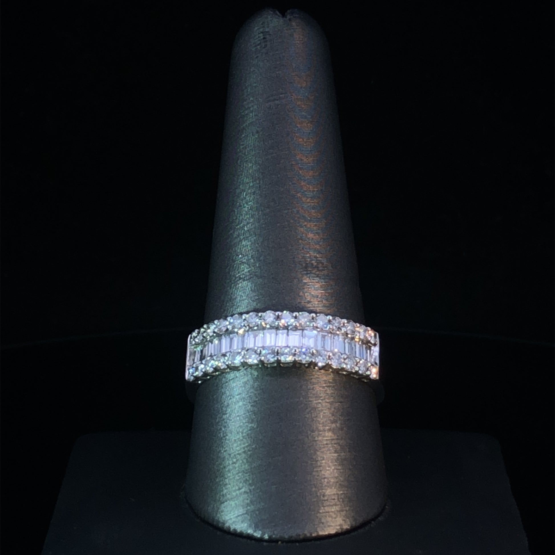 Celebrate an important milestone with this stunning anniversary band. Crafted from 14kt white gold and featuring 1.06ctw of round and baguette diamonds, this elegant piece radiates timeless sophistication and luxury. Create an unforgettable moment with this exquisite and classic gift. This ring is a size 10.25. If that size is not a perfect fit, firs time sizing is free at the time of purchase. Additional sizing fees may apply.