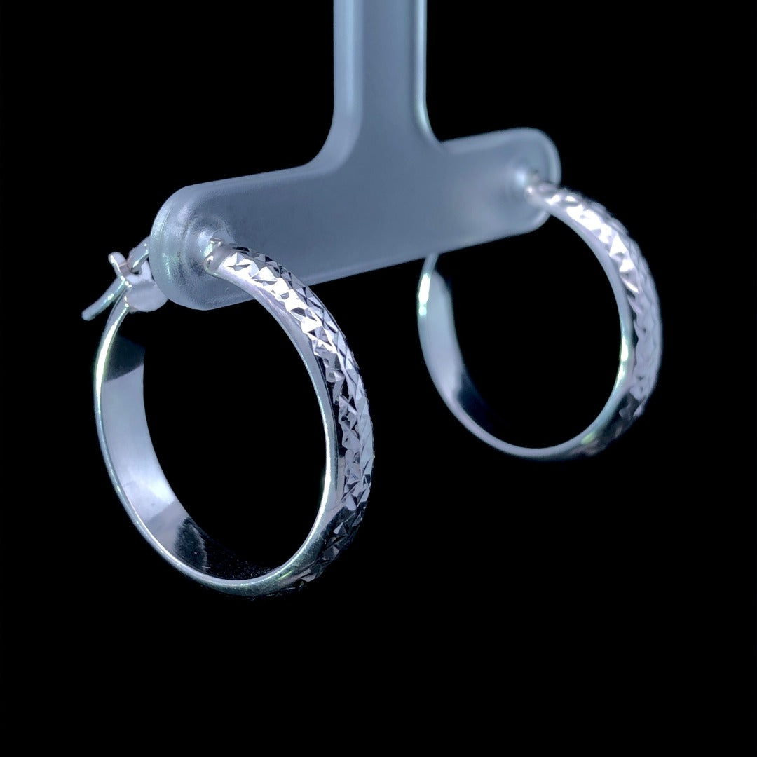 These fabulous 14kt white gold diamond cut hoop earrings are a must-have for your jewelry collection. Delicately crafted and expertly cut, these earrings will add the perfect amount of sparkle to any outfit! Make a statement with these stunning earrings today.