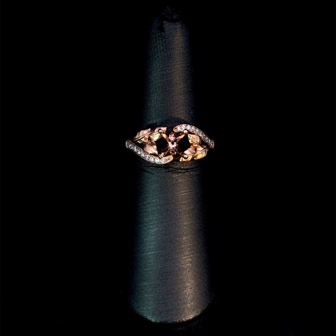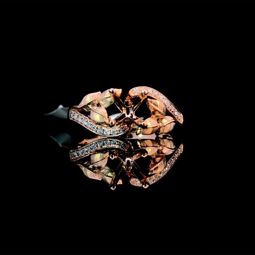 Crafted in 14kt rose gold, this diamond semi mount features a charming floral design with delicate leaves and .12ctw of round diamond accents that gracefully curve around. Designed to hold the center stone of your choice, it offers a beautiful foundation to create a one-of-a-kind piece that truly reflects your individual style. Price is for the semi mount only. Center stone will be added at an additional cost. This ring is a size 6.5. If that size is not a perfect fit, first time sizing is free at the time of purchase. Additional sizing fees may apply.