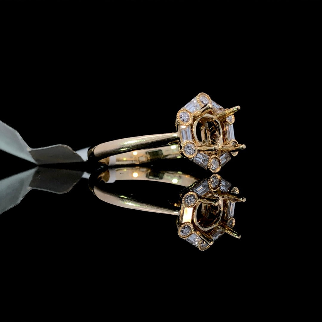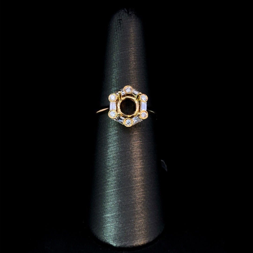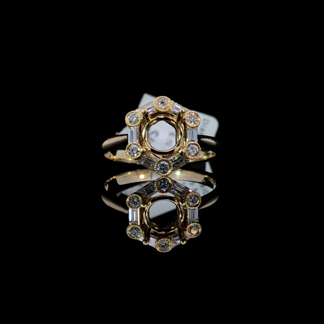 Elevate your style with our stunning diamond semi mount. The intricate halo design, adorned with sparkling round and baguette diamonds totaling .44ctw, adds a touch of luxury to your look. Made of 14kt yellow gold, choose from our wide variety of loose stones to create your dream center stone. Price is for the semi mount only. Center stone will be added at an additional cost. This ring is a size 6.5. If that size is not a perfect fit, first time sizing is free at the time of purchase. Additional sizing fees may apply.