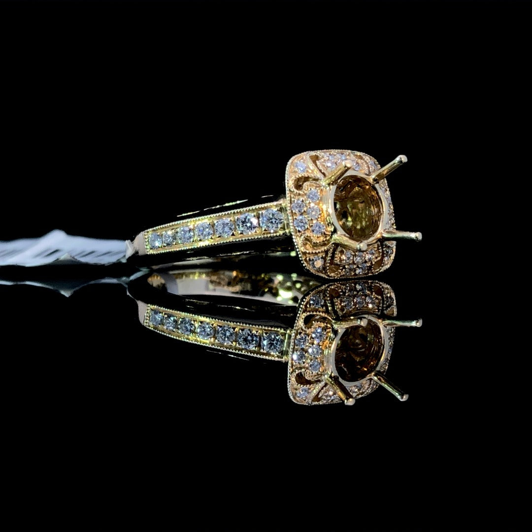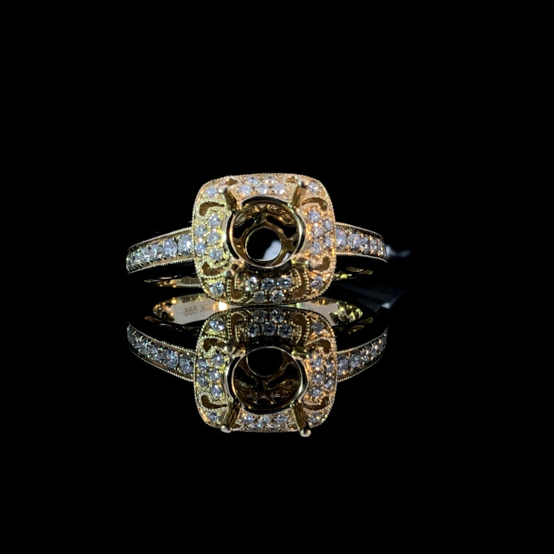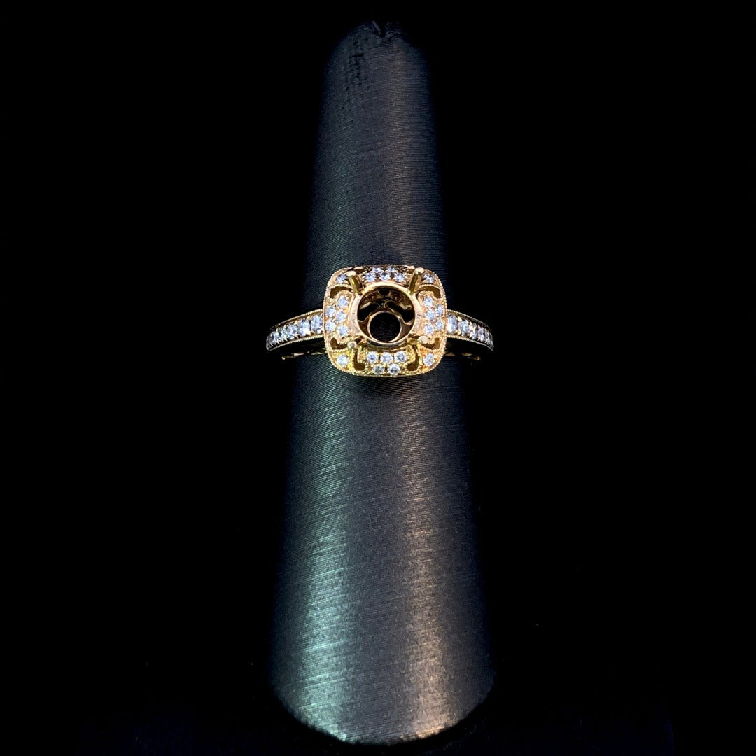 Indulge in luxury with this diamond semi mount. Adorned with a stunning halo, delicate etching, and intricate milgrain detailing, this 14kt yellow gold ring features sparkling .34ctw round diamonds. Complete your perfect piece with a center stone from our exquisite collection. Price is for the semi mount only. Center stone will be added at an additional cost. This ring is a size 6.5. If that size is not a perfect fit, first time sizing is free at the time of purchase. Additional sizing fees may apply.