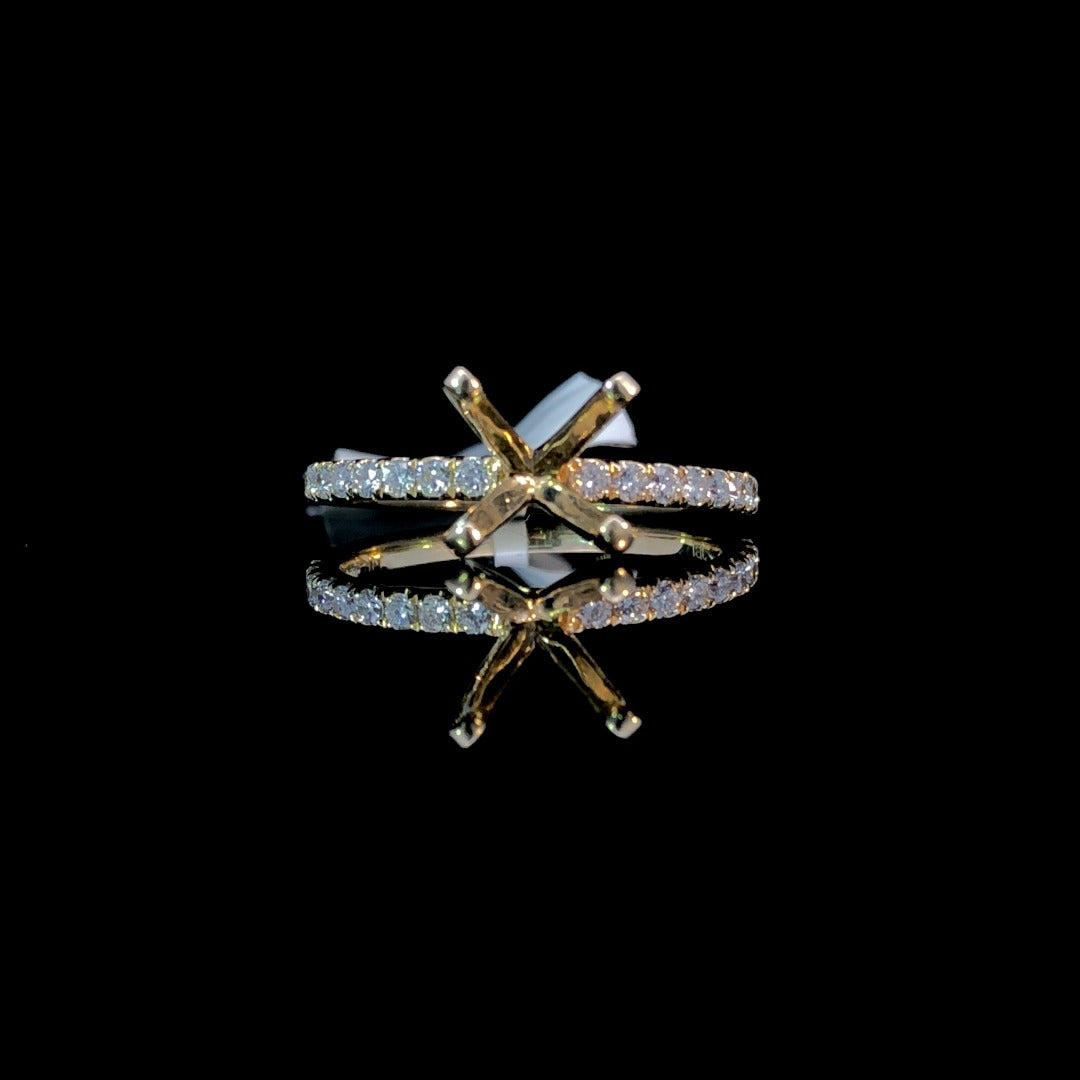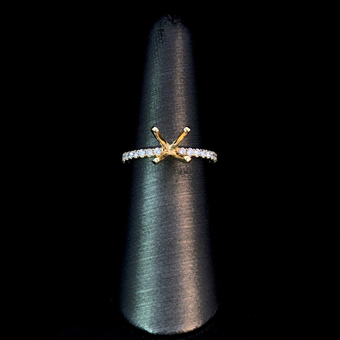 Indulge in luxury with our simple semi mount. Crafted in 14kt yellow gold, this classic band sparkles with .29ctw of round diamonds. Choose your own center stone from our exclusive collection to complete this elegant piece. Perfect for adding a touch of sophistication to any outfit. Price is for the semi mount only. Center stone will be added at an additional cost. This ring is a size 6.5. If that size is not a perfect fit, first time sizing is free at the time of purchase. Additional sizing fees may apply.