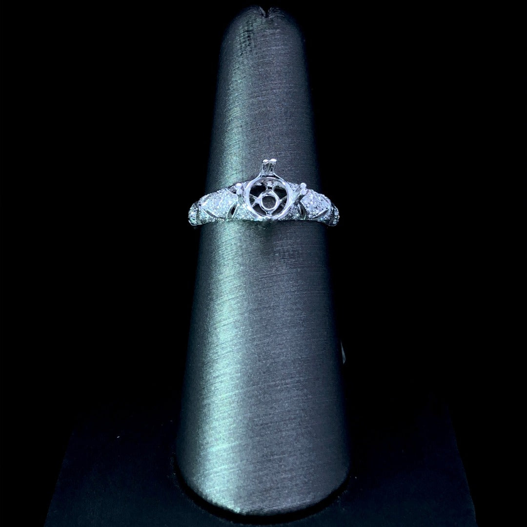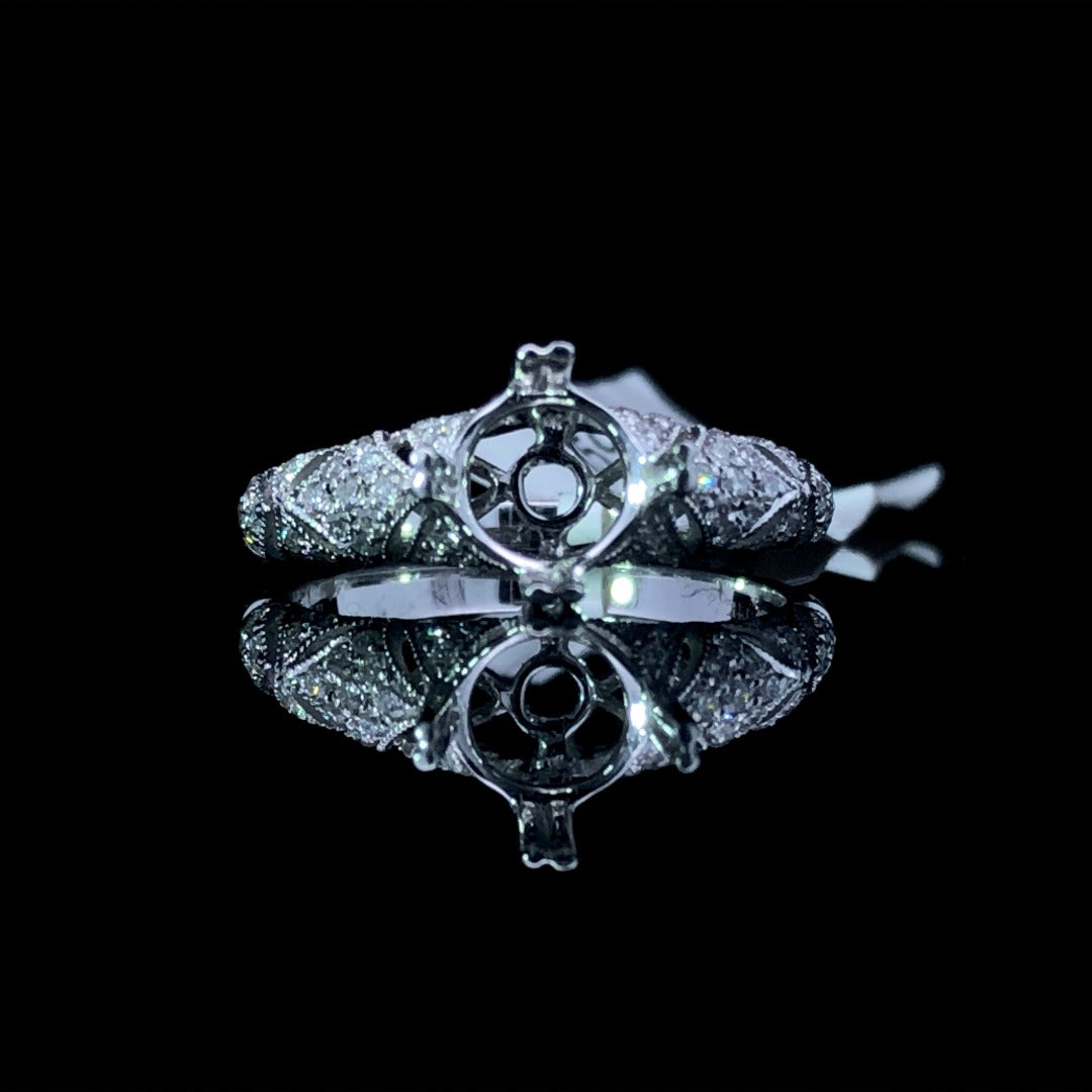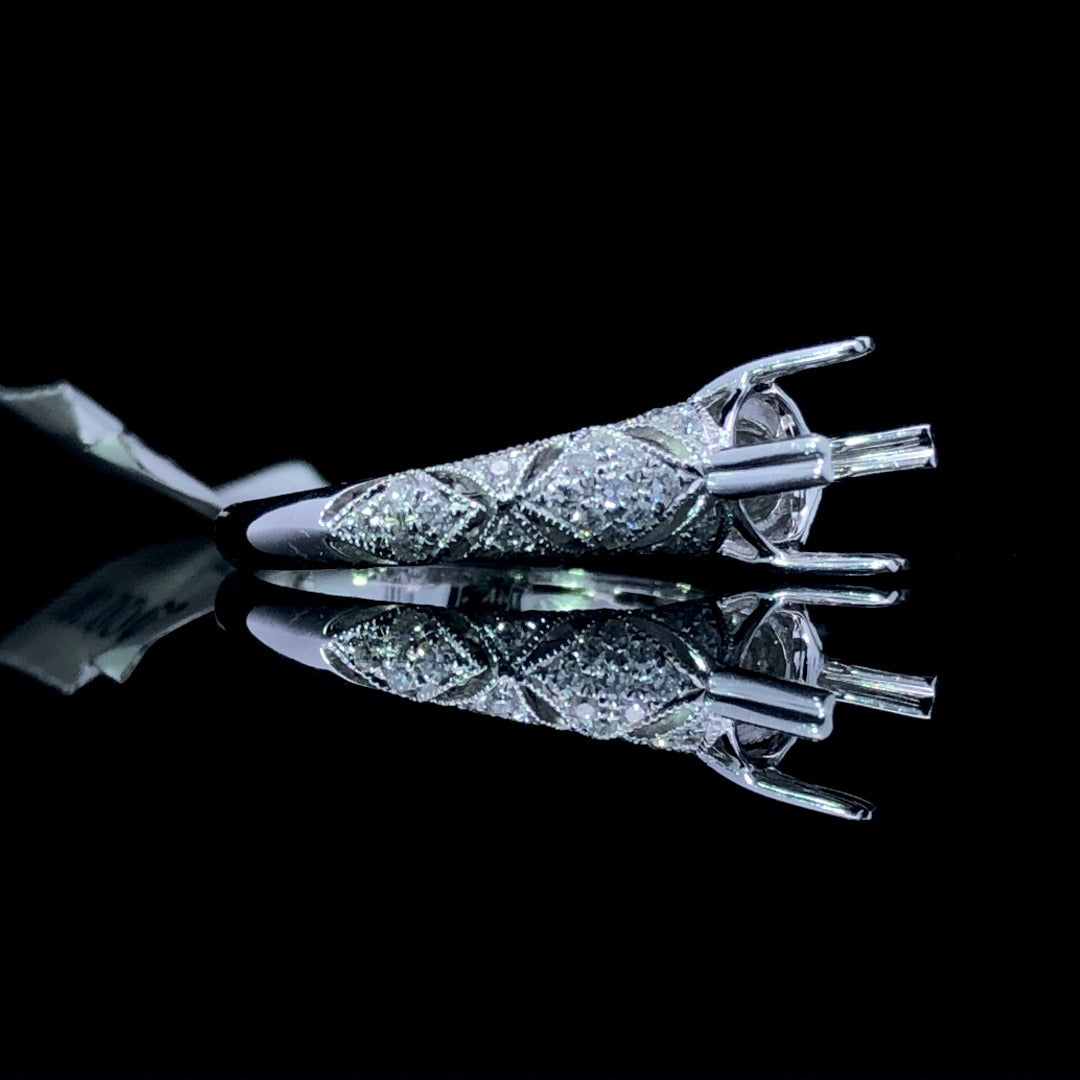 Discover timeless beauty with this 14kt white gold diamond semi-mount. Boasting .34ctw of diamonds and a beautiful filigree style design, this piece is perfect for a truly alluring look. Add your own center stone for a uniquely personal touch and show off your sophisticated style. Price is for the semi mount only. Center stone will be added at an additional cost. This ring is a size 6.5. If that size is not a perfect fit, first time sizing is free at the time of purchase. Additional sizing fees may apply.