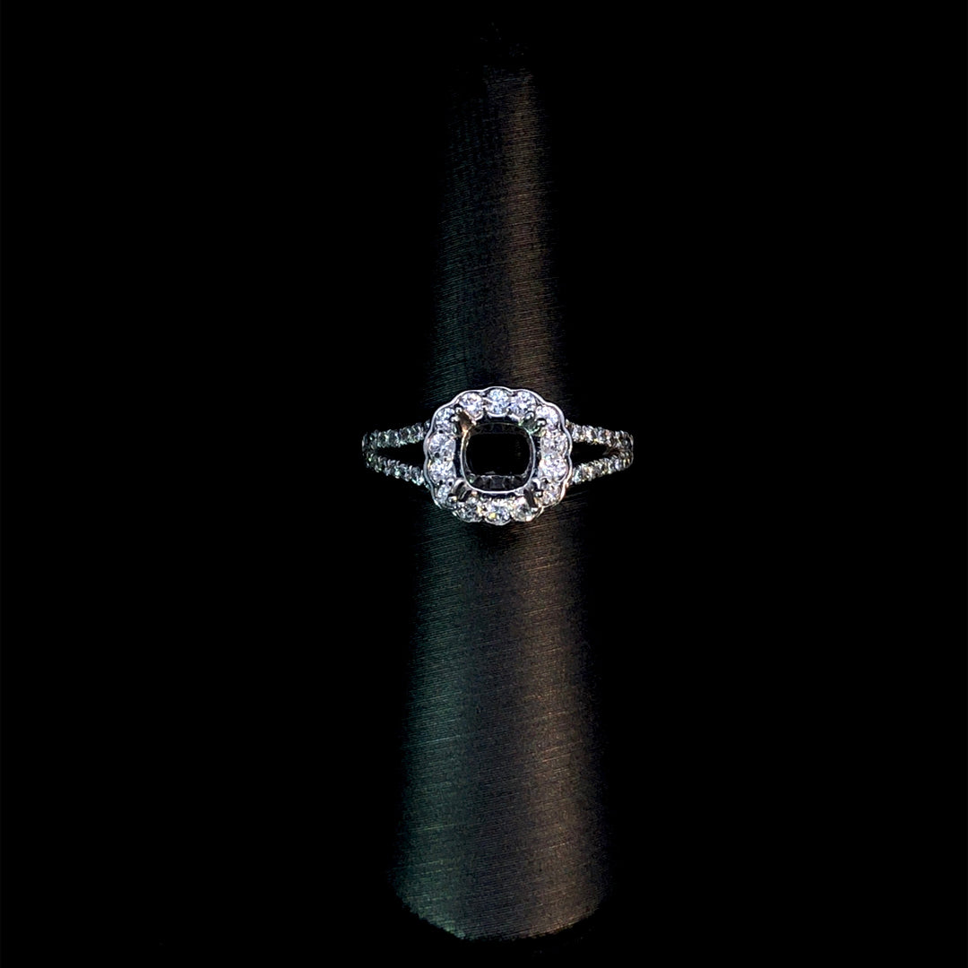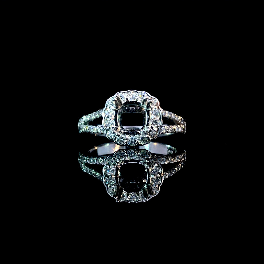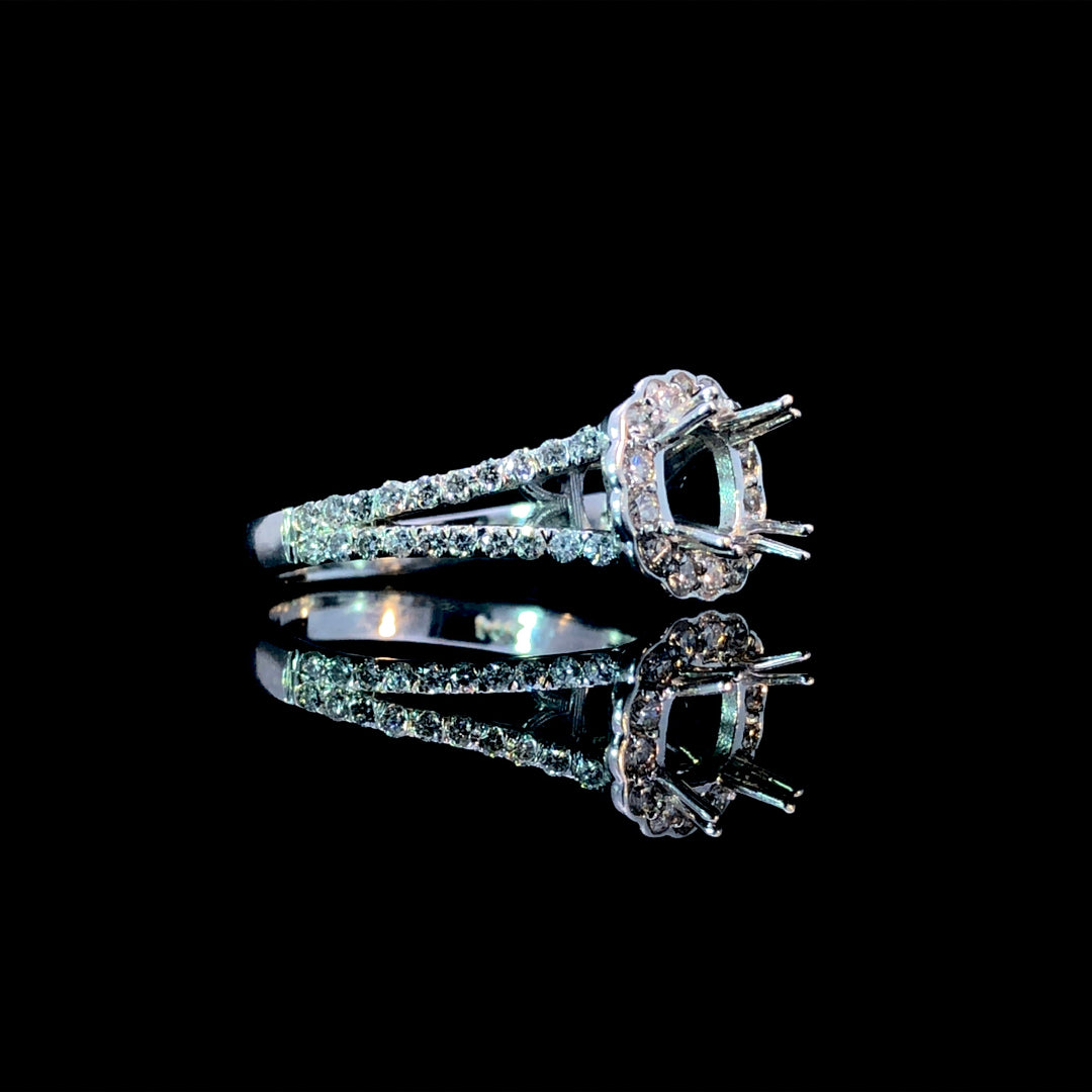 Create your dream ring with this magnificent 14kt white gold semi mount, featuring a stunning halo and elegantly split shank band adorned with .71ctw of round diamonds. This versatile setting allows you to choose your own center stone from our exceptional collection of loose diamonds, allowing you to craft a piece that's entirely your own. Price is for the semi mount only. Center stone will be added at an additional cost. This ring is a size 6.5. If that size is not a perfect fit, first time sizing is free at the time of purchase. Additional sizing fees may apply.