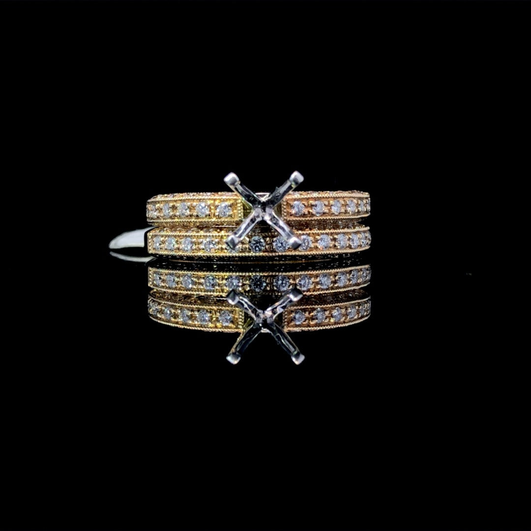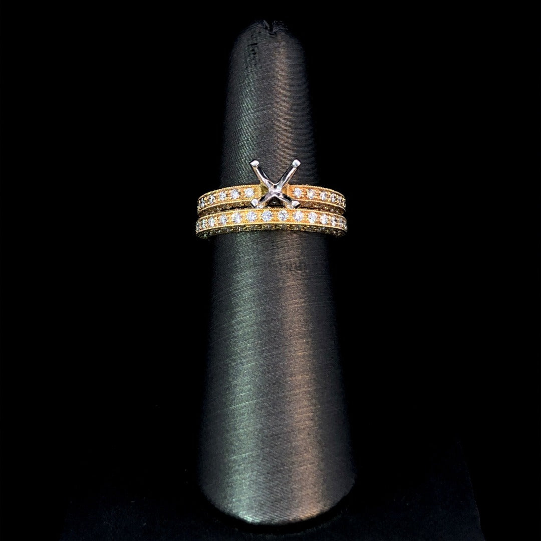 Indulge in the height of luxury with this gorgeous diamond semi mount. Crafted with .34ctw of brilliant round diamonds and delicate milgrain detailing, this 14kt yellow gold piece radiates elegance. Complete this breathtaking look by selecting a center stone from our wide range of loose stones. Enhance the beauty with the matching .39ctw diamond band (sold separately). Price is for the semi mount only. Center stone will be added at an additional cost. This ring is a size 6.5. If that size is not a perfect fit, first time sizing is free at the time of purchase. Additional sizing fees may apply.
