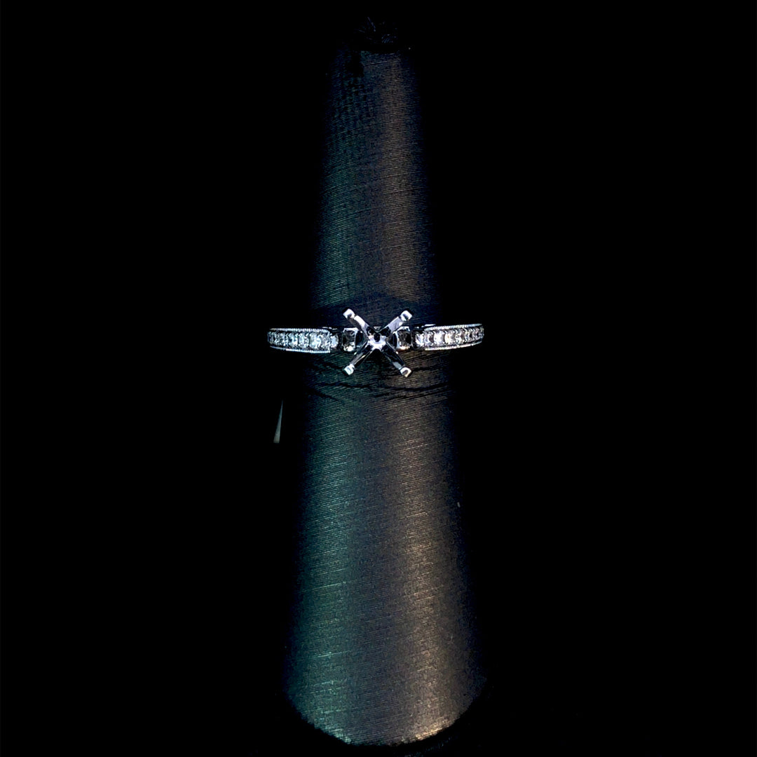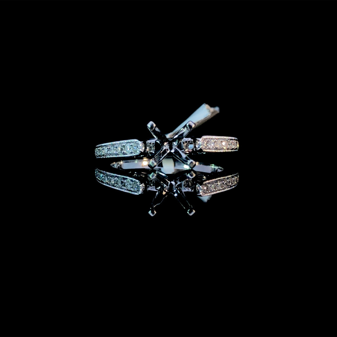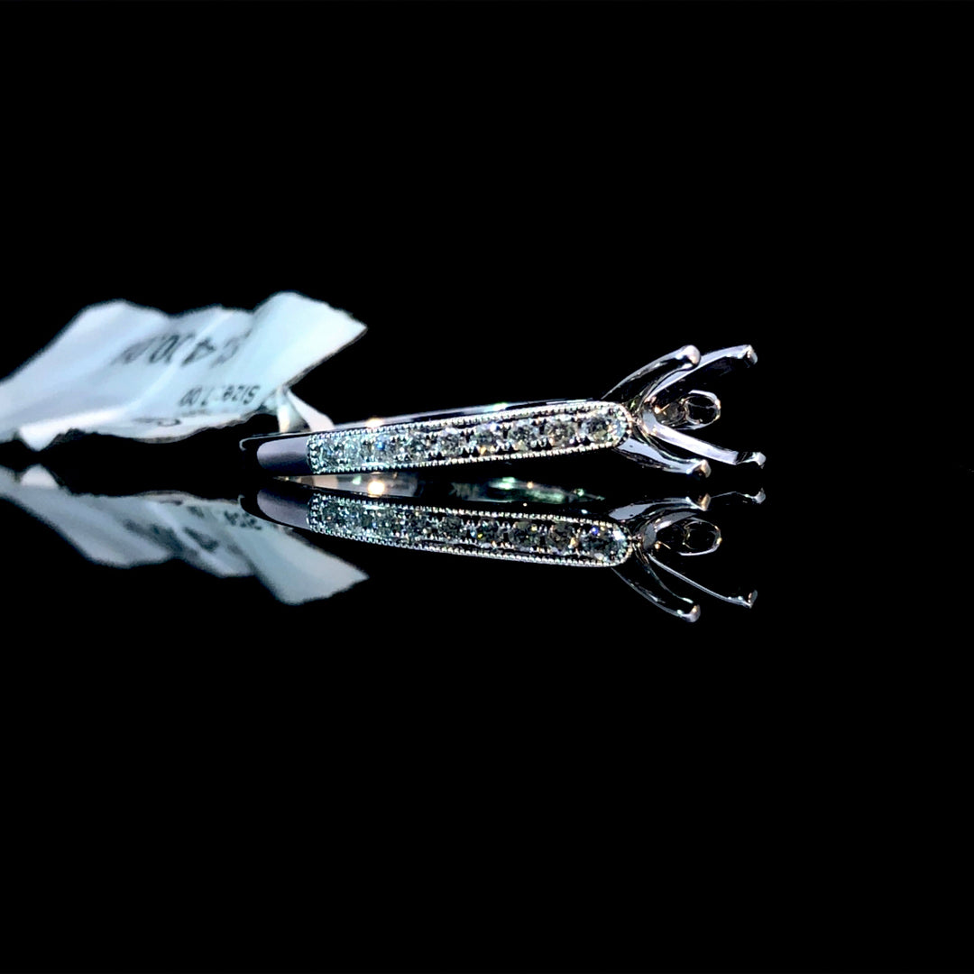 This elegant 14kt white gold semi mount ring showcases a timeless design with .23ctw of round diamonds cascading along the band, enhanced by delicate milgrain details. Intricate filigree work beneath the head adds a touch of vintage glamour. Personalize your ring by selecting a center stone from our extensive collection of loose diamonds, creating a unique piece that perfectly reflects your style. Price is for the semi mount only. Center stone will be added at an additional cost. This ring is a size 7. If that size is not a perfect fit, first time sizing is free at the time of purchase. Additional sizing fees may apply.