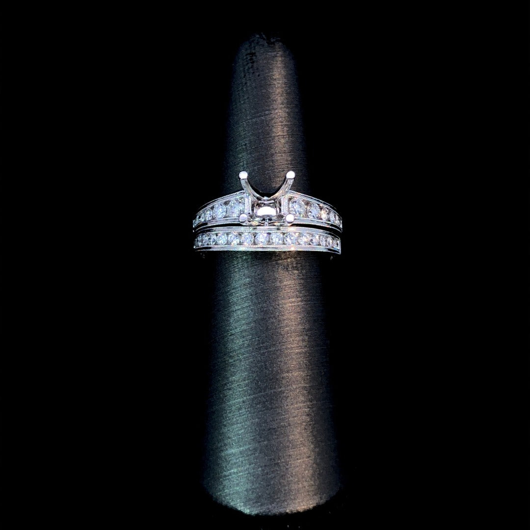 Looking for a timeless diamond piece? Look no further! This gorgeous semi mount showcases .43ctw of sparkling round diamonds channel set in 14kt white gold with a delicate double milgrain edge. Choose your perfect center stone from our wide selection and complete the set with a matching .33ctw diamond band (sold separately). Price is for the semi mount only. Center stone and band will be added at an additional cost. This ring is a size 6.5. If that size is not a perfect fit, first time sizing is free at the time of purchase. Additional sizing fees may apply.
