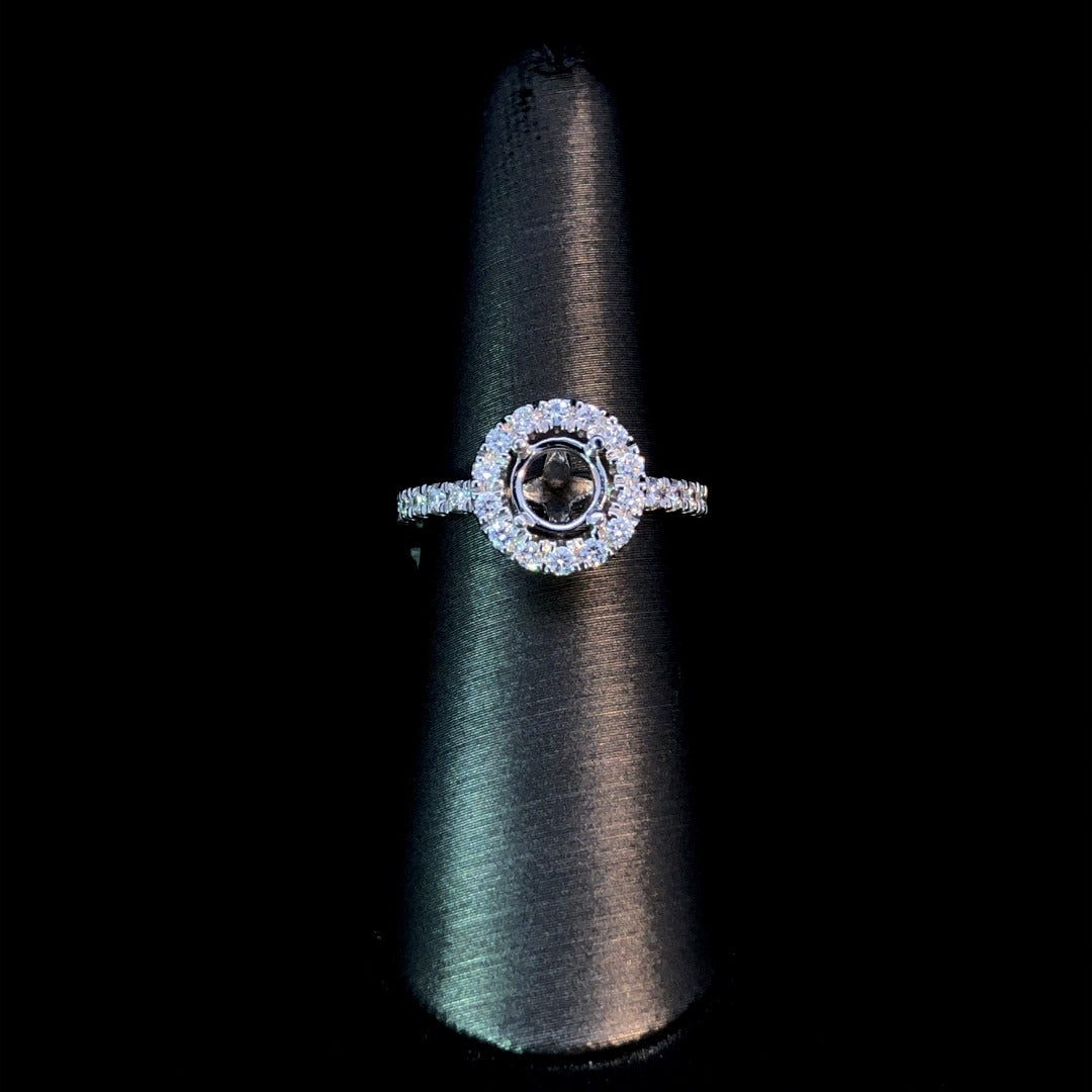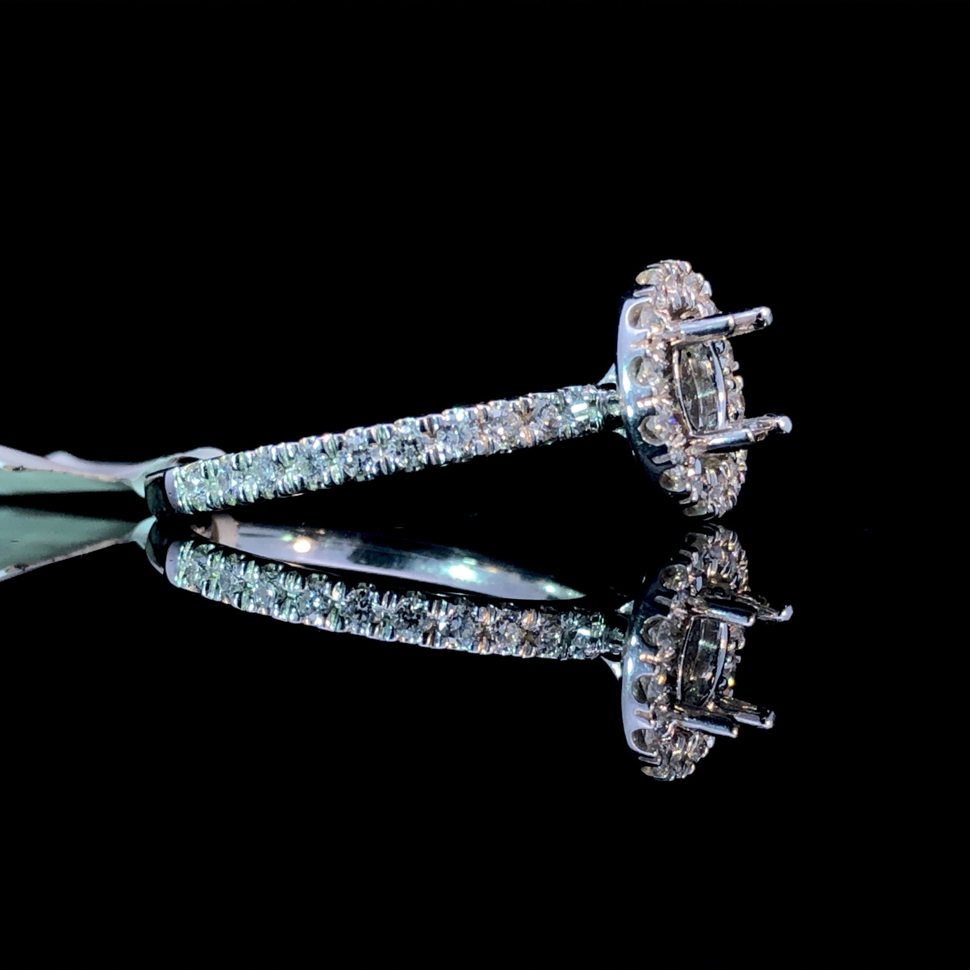 Elevate your style with our classic diamond semi mount. Featuring a stunning round diamond halo and cascading diamonds on a 14kt white gold band, this timeless design exudes elegance. With a total diamond weight of .50ctw and your choice of center stone, you'll shine for years to come. Price is for the semi mount only. Center stone will be added at an additional cost. This ring is a size 6.5. If that size is not a perfect fit, first time sizing is free at the time of purchase. Additional sizing fees may apply.