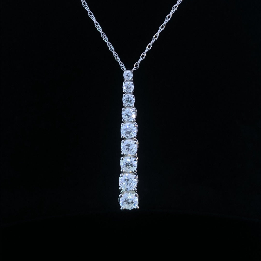 Crafted from 14 karat white gold and featuring nine graduating diamonds for a total of 1 carat in weight, this pendant combines timeless elegance with a modern silhouette. With its exquisite sparkle and luxurious luster, it's the perfect choice for those looking for sophistication and exclusivity. Chain is not included.