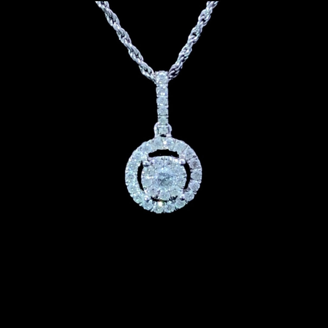 Make a statement with this dazzling 14K white gold diamond cluster pendant! Its timeless design features a glamorous cluster in the center, enclosed by a brilliant diamond halo, and topped off with a stunning diamond bail for a total diamond weight of .33ctw. Show your style and sophistication with this show-stopping piece! Chain is not included.