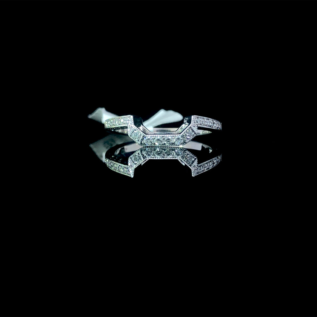 Enhance your engagement ring with this diamond contour band. Designed to fit flawlessly with select styles, it boasts a .25ctw of sparkling round diamonds set in 14kt white gold with intricate milgrain detailing. This ring is a size 6. If that size is not a perfect fit, first time sizing is free at the time of purchase. Additional sizing fees may apply.