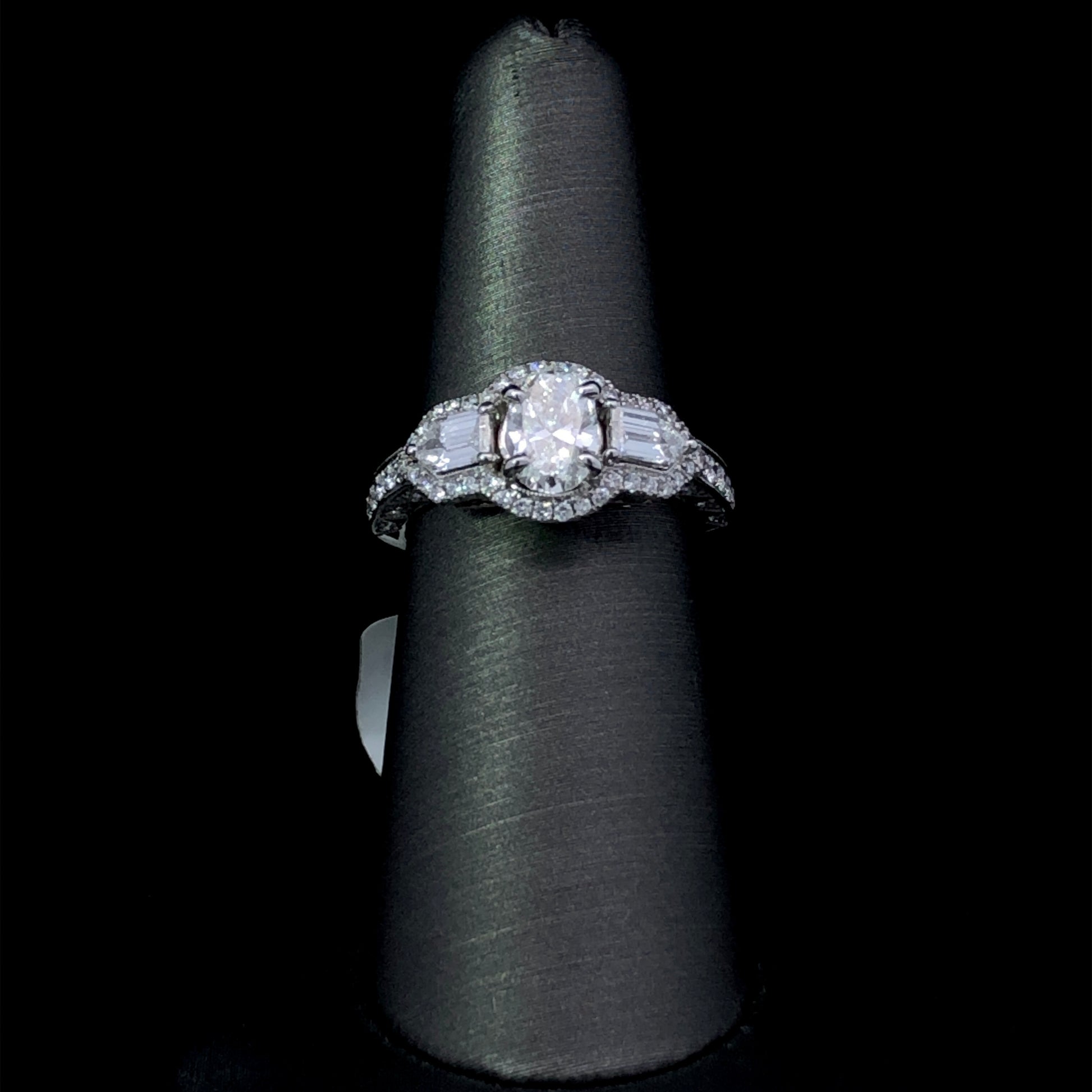 This luxurious 14kt white gold ring features a certified .81ct oval diamond as its centerpiece, bordered by 1.15ctw of diamond accents that include two outstanding side stones. Highlighted by timeless elegance and quality craftsmanship, this exquisite ring is perfect for any occasion. With a total carat weight of 1.96, you are sure to stand out! This ring is a size 6.75. If that size is not a perfect fit, first time sizing is free at the time of purchase. Additional sizing fees may apply.