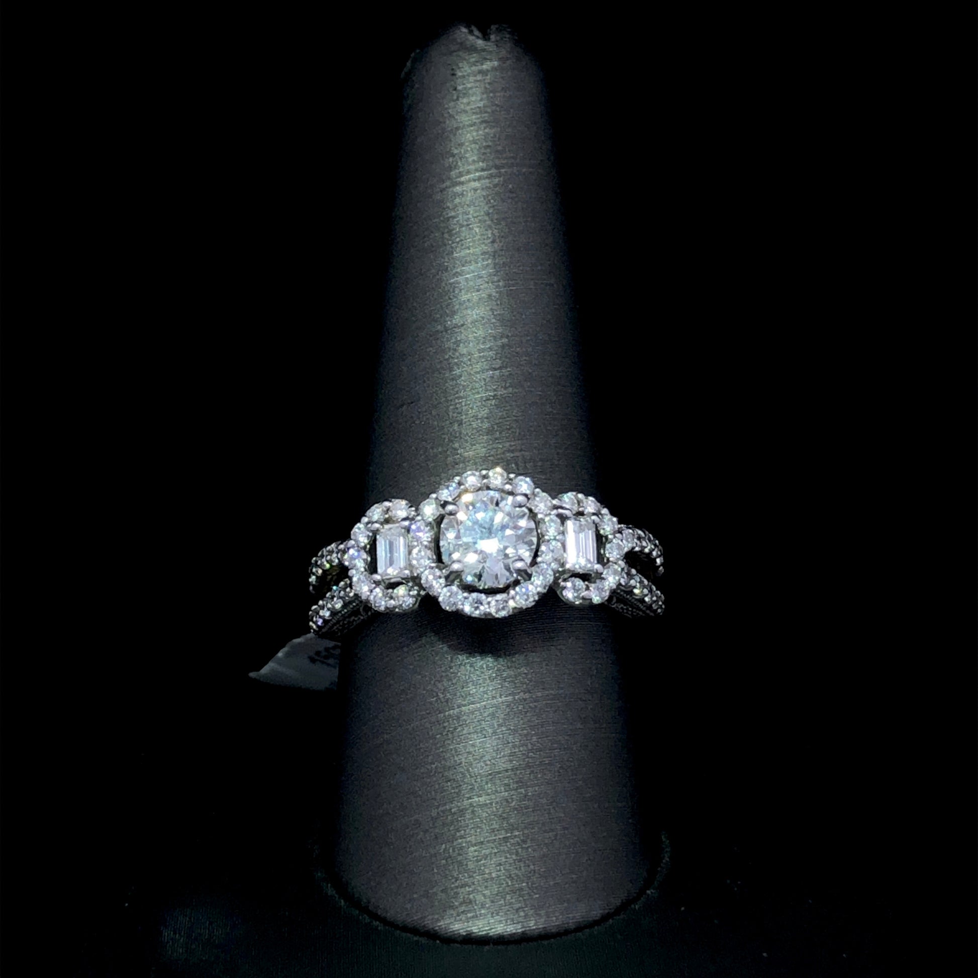 This exquisite ring features a dazzling .97 ct round diamond at its center, captivatingly surrounded by 1.00 ctw of diamond accents set in a graceful 14kt white gold split shank mounting. From its gorgeous centerpiece to its luxurious styling, this ring is an elegant and timeless representation of classic style. This ring is a size 9.5. If that size is not a perfect fit, first time sizing is free at the time of purchase. Additional sizing fees may apply.