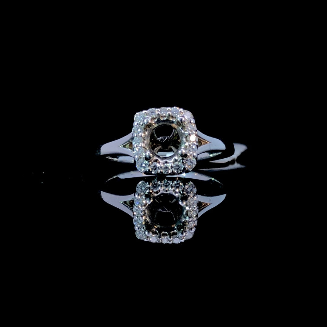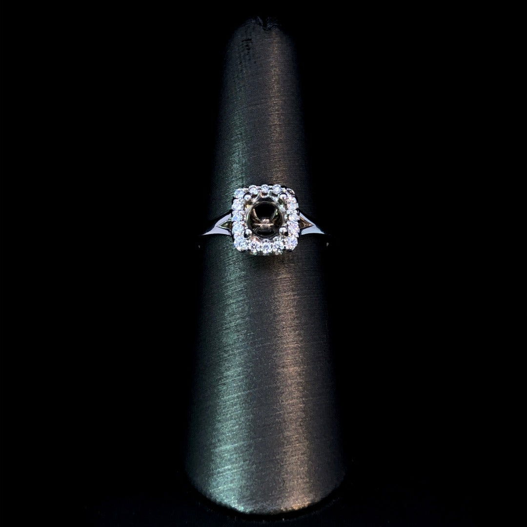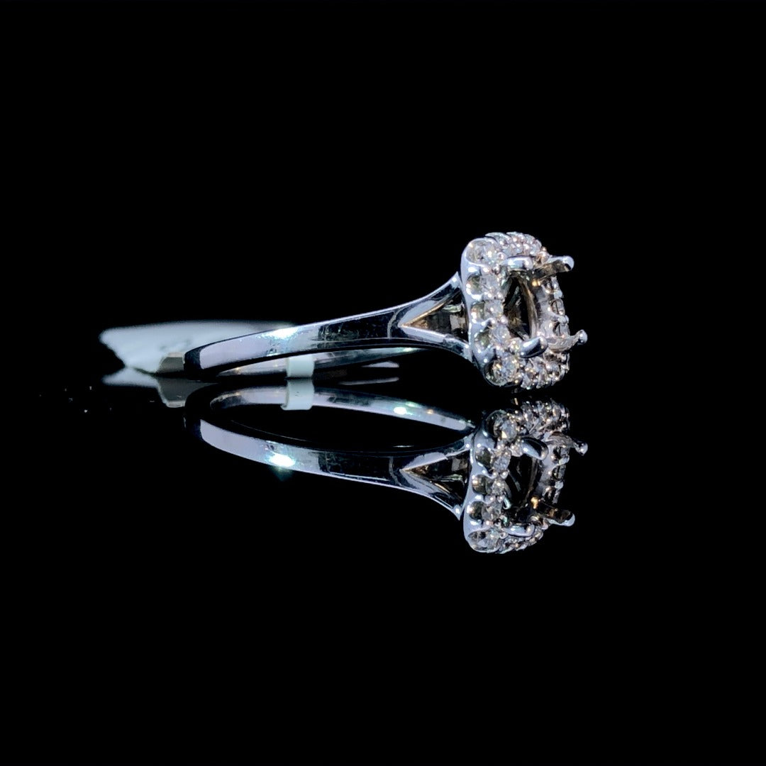 Show off simple elegance with this diamond semi mount. The sophisticated design features a dazzling diamond halo with .22ctw of round diamonds, set on a sleek 14kt white gold split shank band. Choose your own center stone from our unbeatable selection to complete this timeless piece. Price is for the semi mount only. Center stone will be added at an additional cost. This ring is a size 6.5. If that size is not a perfect fit, first time sizing is free at the time of purchase. Additional sizing fees may apply.