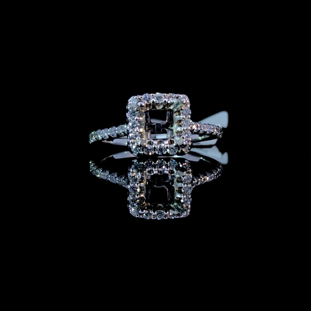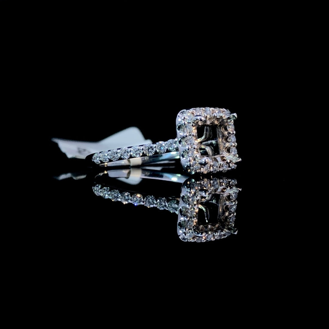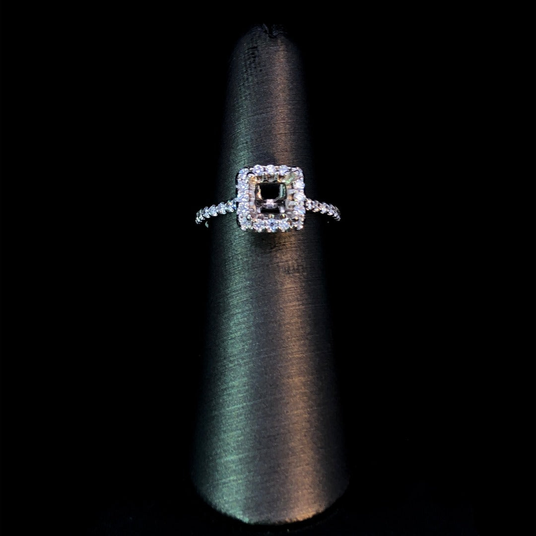 Experience the timeless elegance of this gorgeous diamond semi mount. Its stunning halo design and diamond-adorned band, crafted in 14kt white gold, add a touch of glamour. With the option to select your own center stone from our extensive collection, this .45ctw beauty is truly one-of-a-kind. Price is for the semi mount only. Center stone will be added at an additional cost. This ring is a size 5.75. If that size is not a perfect fit, first time sizing is free at the time of purchase. Additional sizing fees may apply.