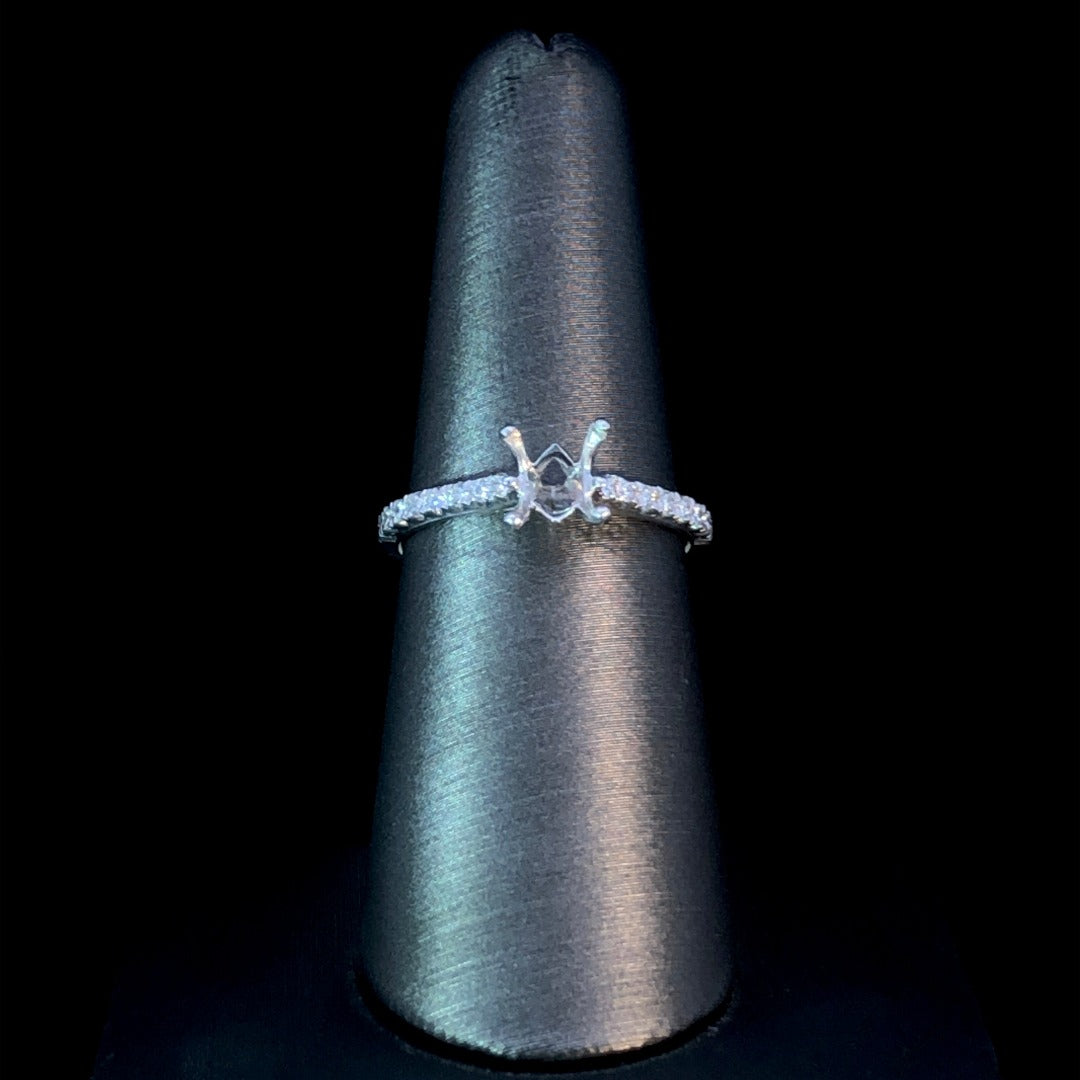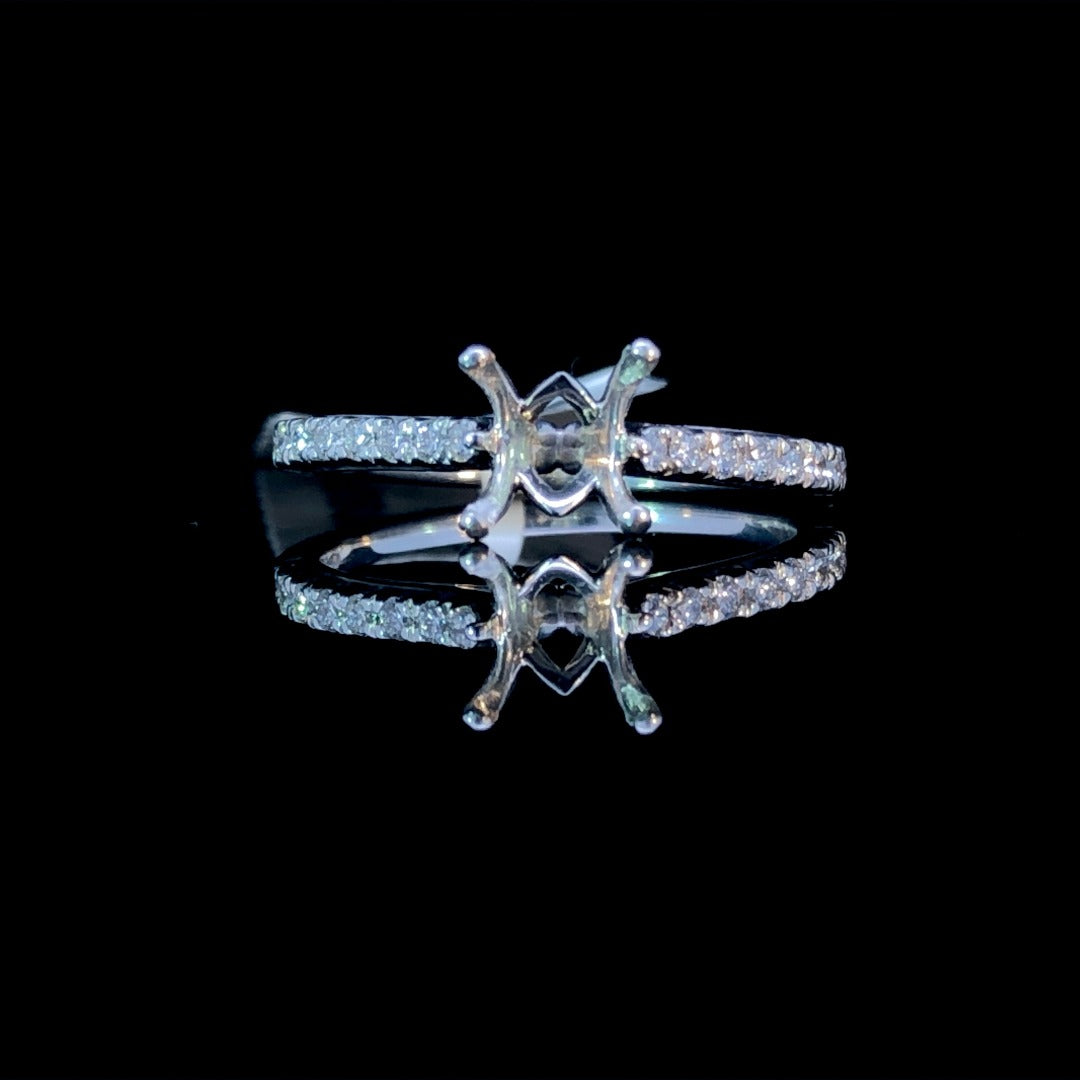 This 14kt white gold diamond semi mount is a luxurious creation. Expertly crafted with .24ctw of round diamonds set on a graceful cathedral style band with an ornate head, this mount will serve as the center stage for the most special stone of your choosing. Let its elegance be the perfect culmination of your dreams. Price is for the semi mount only. Center stone will be added at an additional cost. This ring is a size 7. If that size is not a perfect fit, first time sizing is free at the time of purchase. Additional sizing fees may apply.