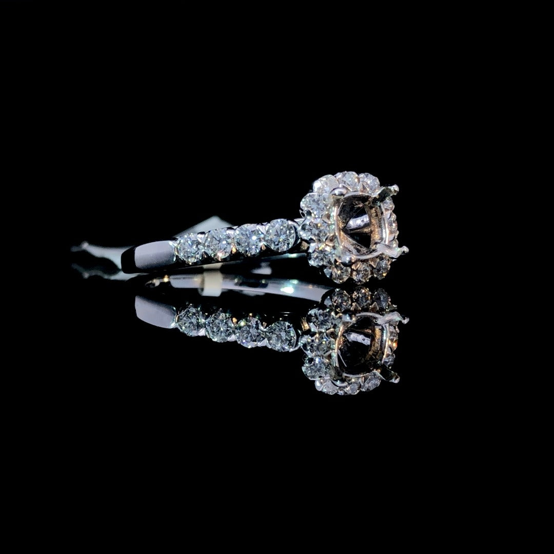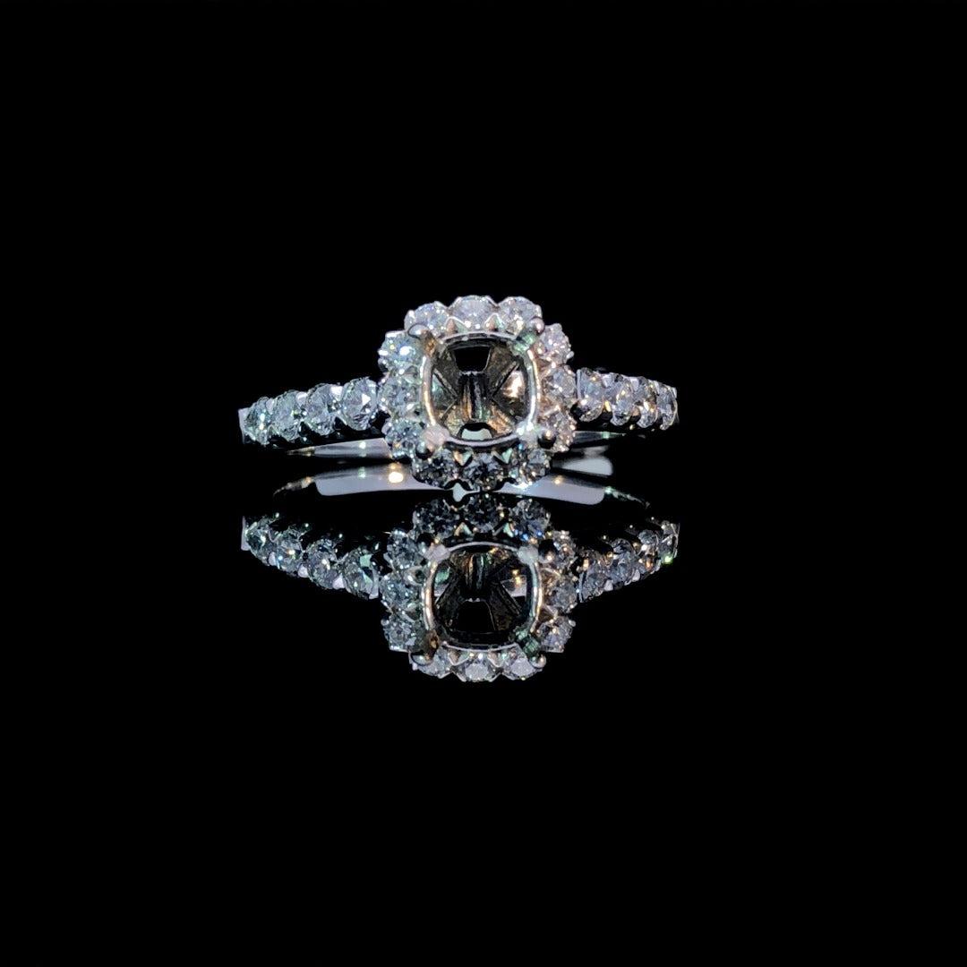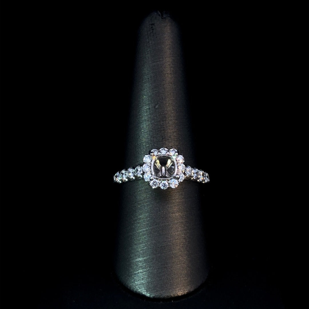 Looking for a timeless and elegant engagement ring? Look no further! This beautiful diamond semi mount features a stunning cushion shaped halo and diamonds down the band. Made with 14kt white gold and a total diamond weight of .73ctw, this piece is sure to shine for years to come. Personalize it with a center stone of your choice from our collection. Price is for the semi mount only. Center stone will be added at an additional cost. This ring is a size 9. If that size is not a perfect fit, firs time sizing is free at the time of purchase. Additional sizing fees may apply.