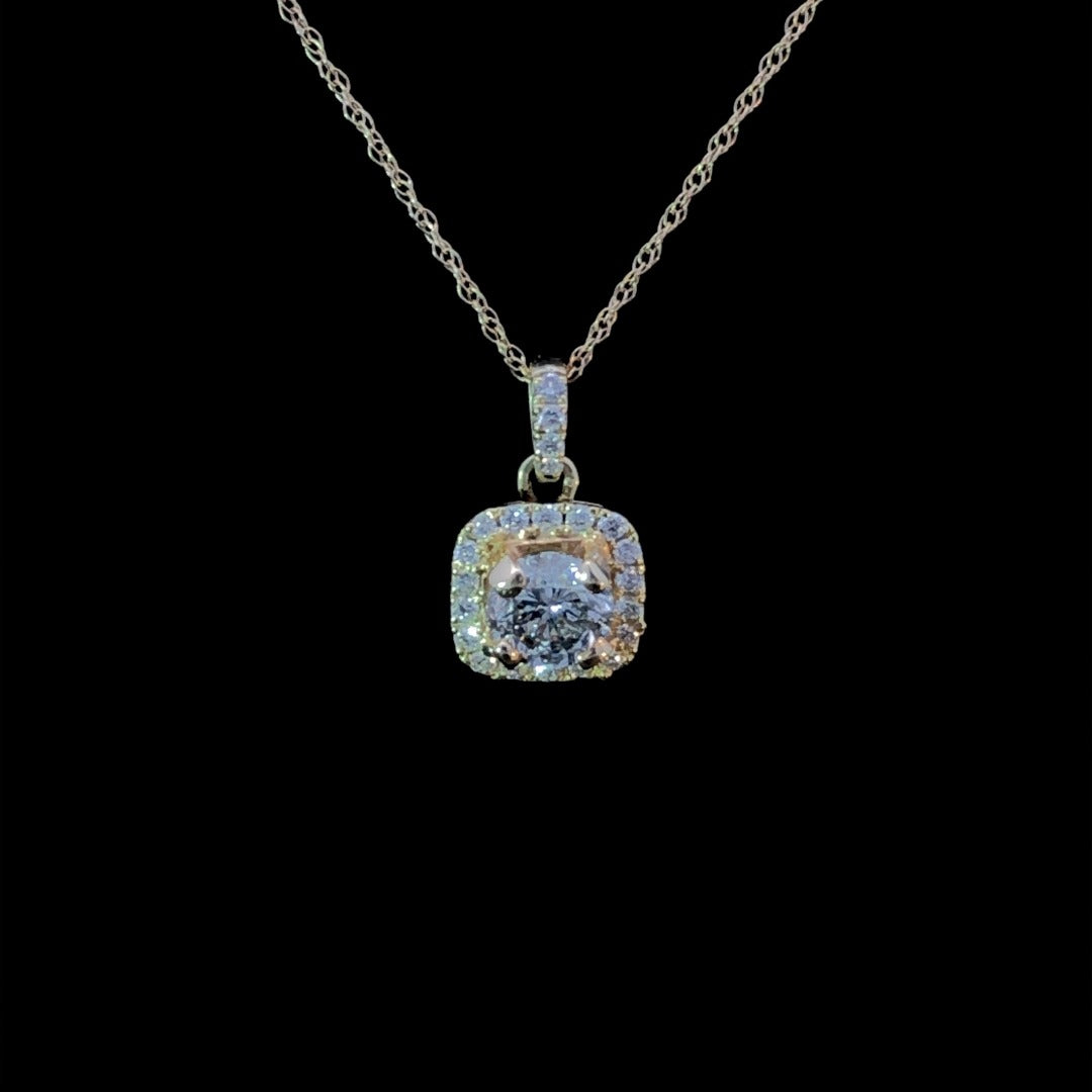 This dazzling diamond pendant is the perfect addition to any jewelry box. Crafted in 14kt yellow gold, a .55ct round diamond sparkles at the center, surrounded by a halo and bail of shimmering .13ctw diamonds. Chain is not included.