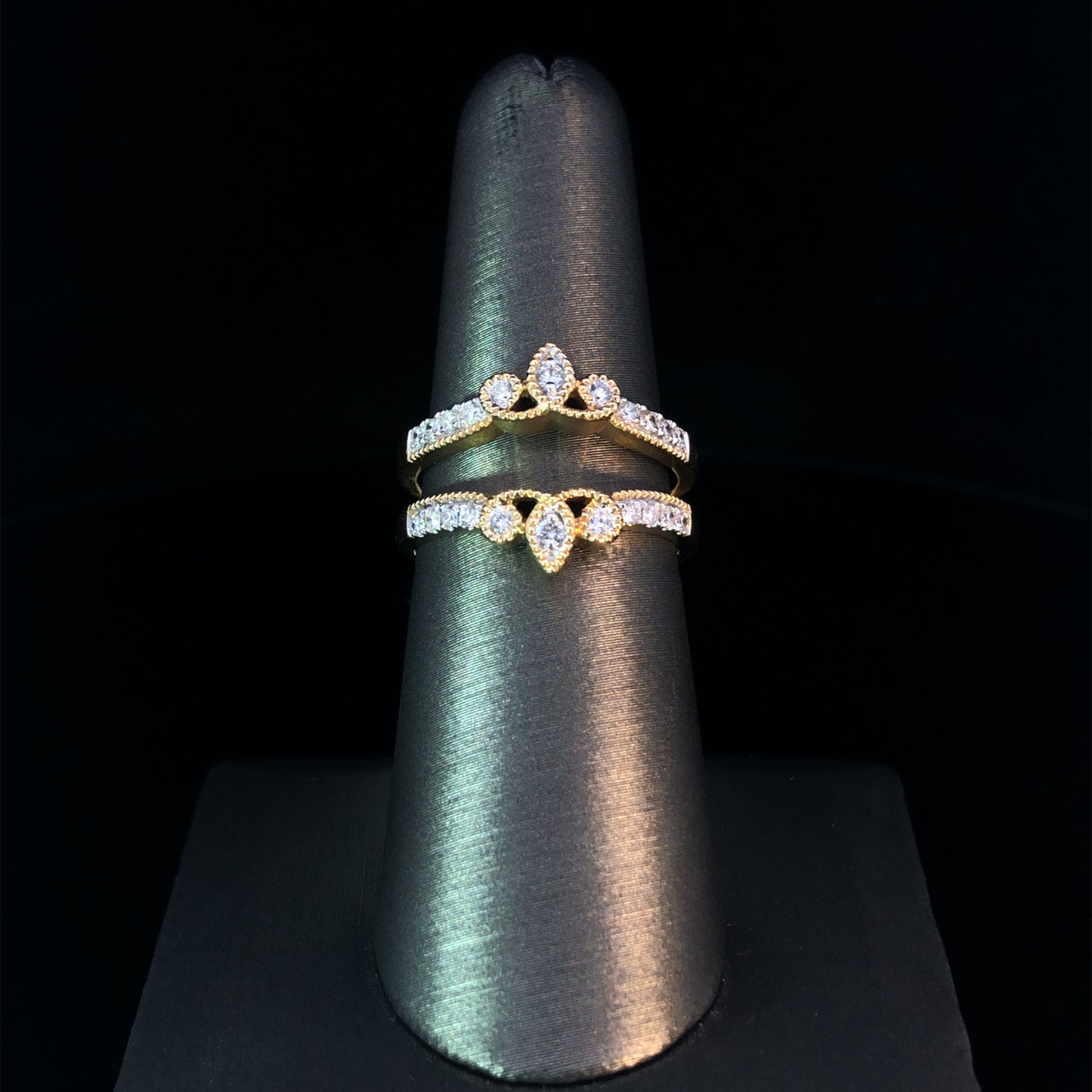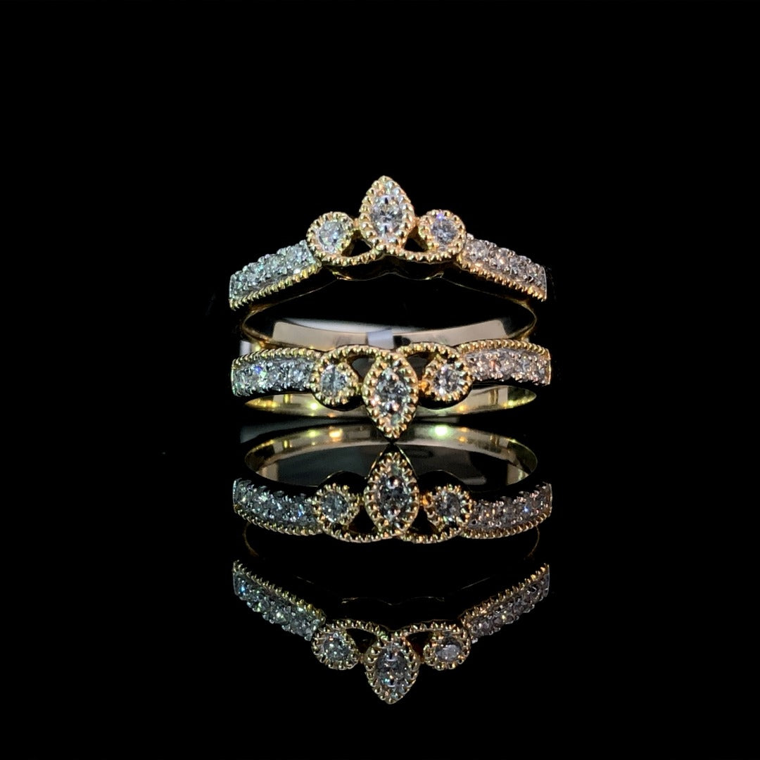 Adorn your lovely engagement ring with this beautiful 14Kt yellow gold guard! Boasting .33ctw of sparkling round diamonds with milgrain and decorative twists, this ring guard will add element of sophistication and elegance to any bridal look. This ring is a size 6.75. If that size is not a perfect fit, first time sizing is free at the time of purchase. Additional sizing fees may apply.