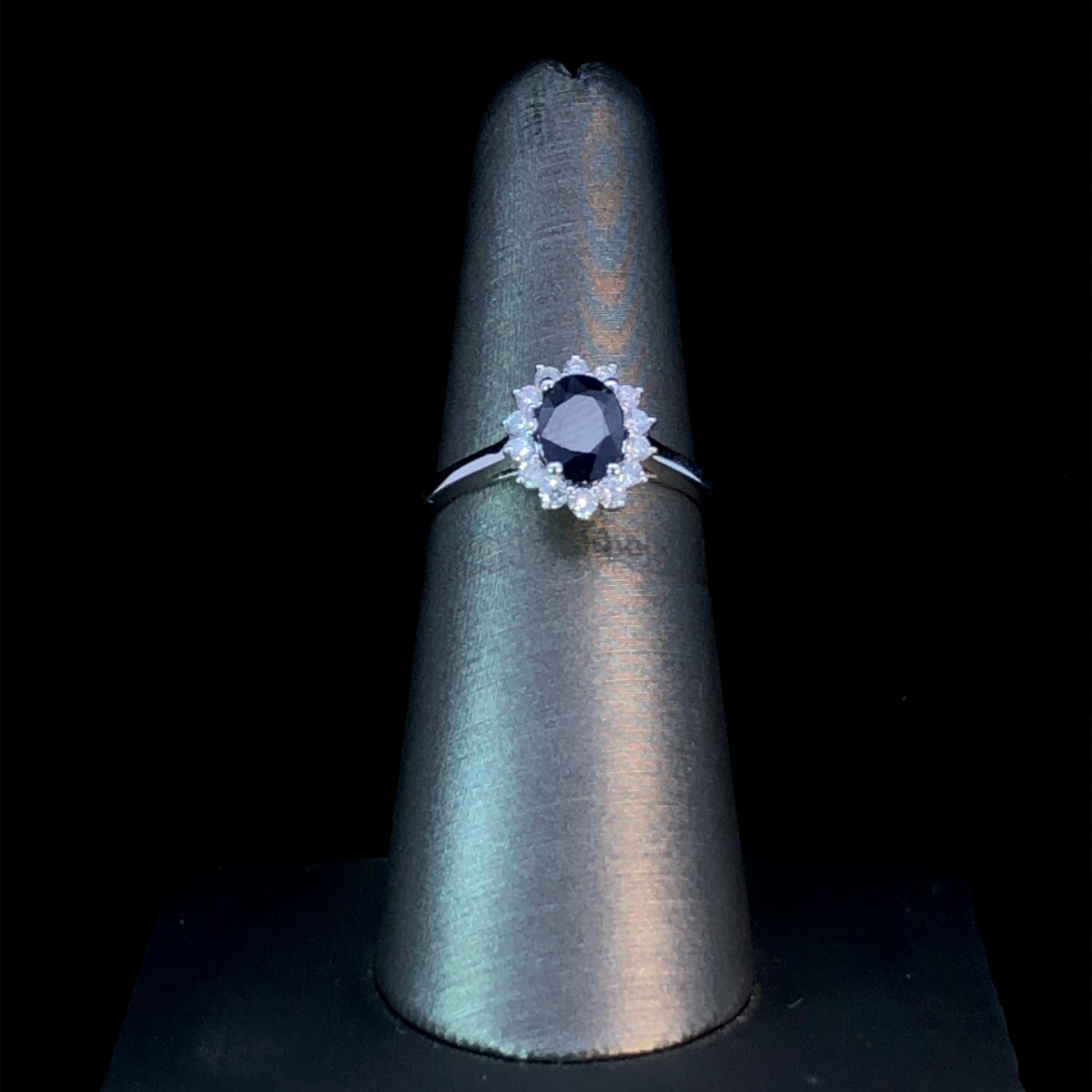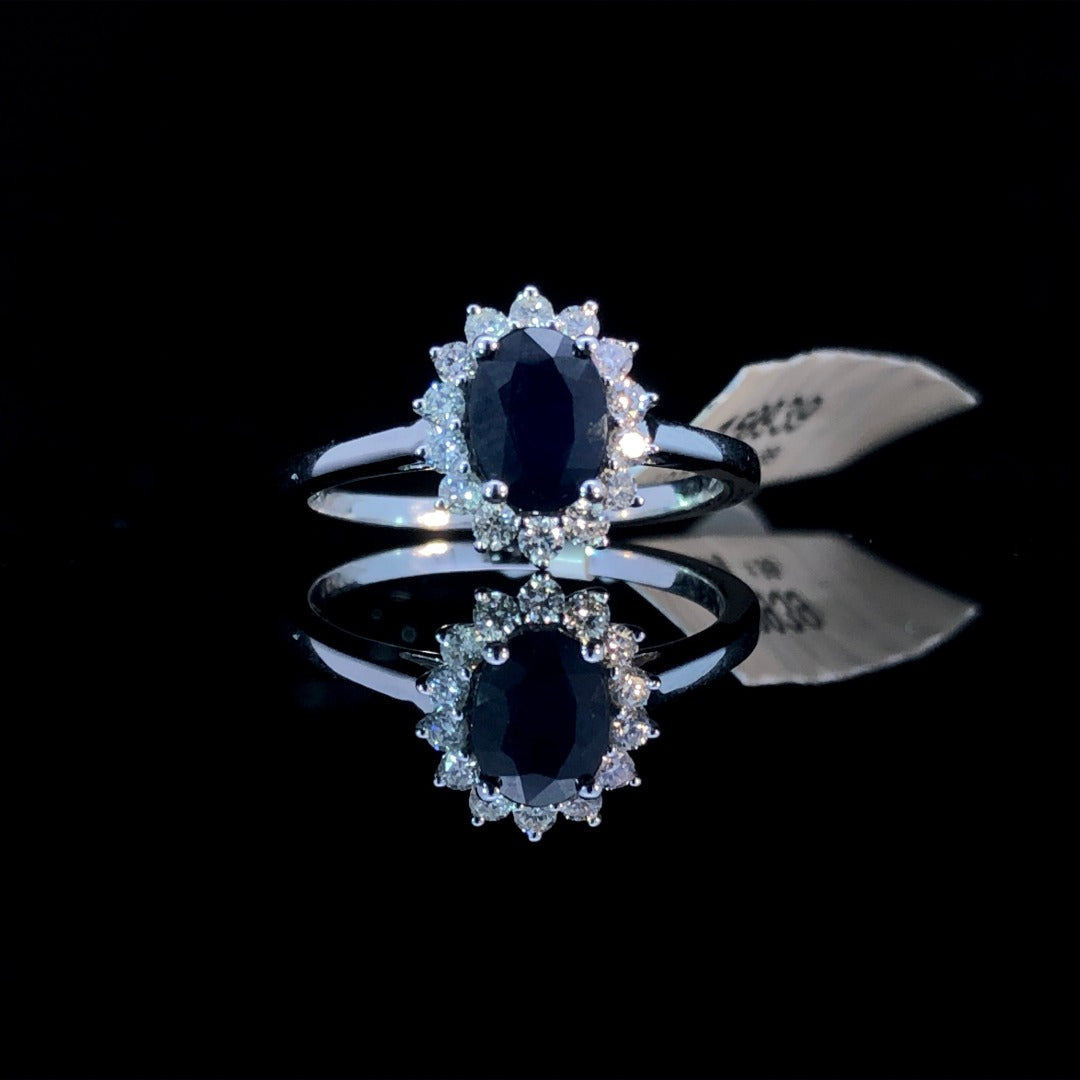 This elegant gemstone ring’s classic design offers a tasteful and exclusive aesthetic. Featuring a captivating .90ct oval sapphire at the center, surrounded by a halo of .26ctw in round diamonds, all set in 10kt white gold - it is sure to add a touch of sophistication to any ensemble. This ring is a size 6.5. If that size is not a perfect fit, first time sizing is free at the time of purchase. Additional sizing fees may apply.