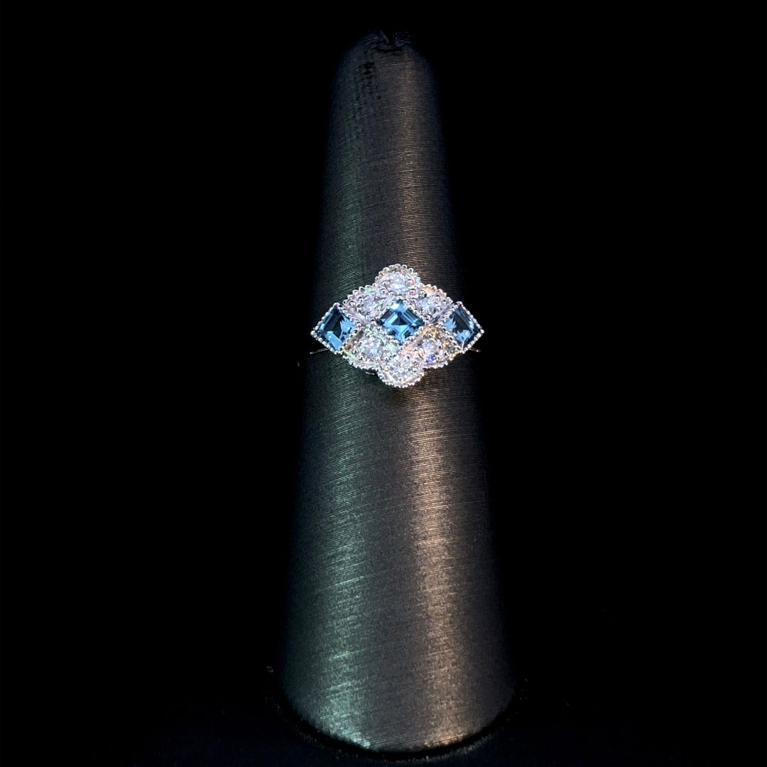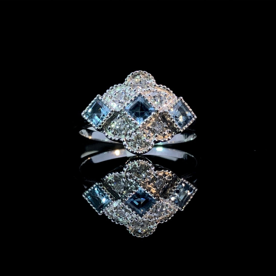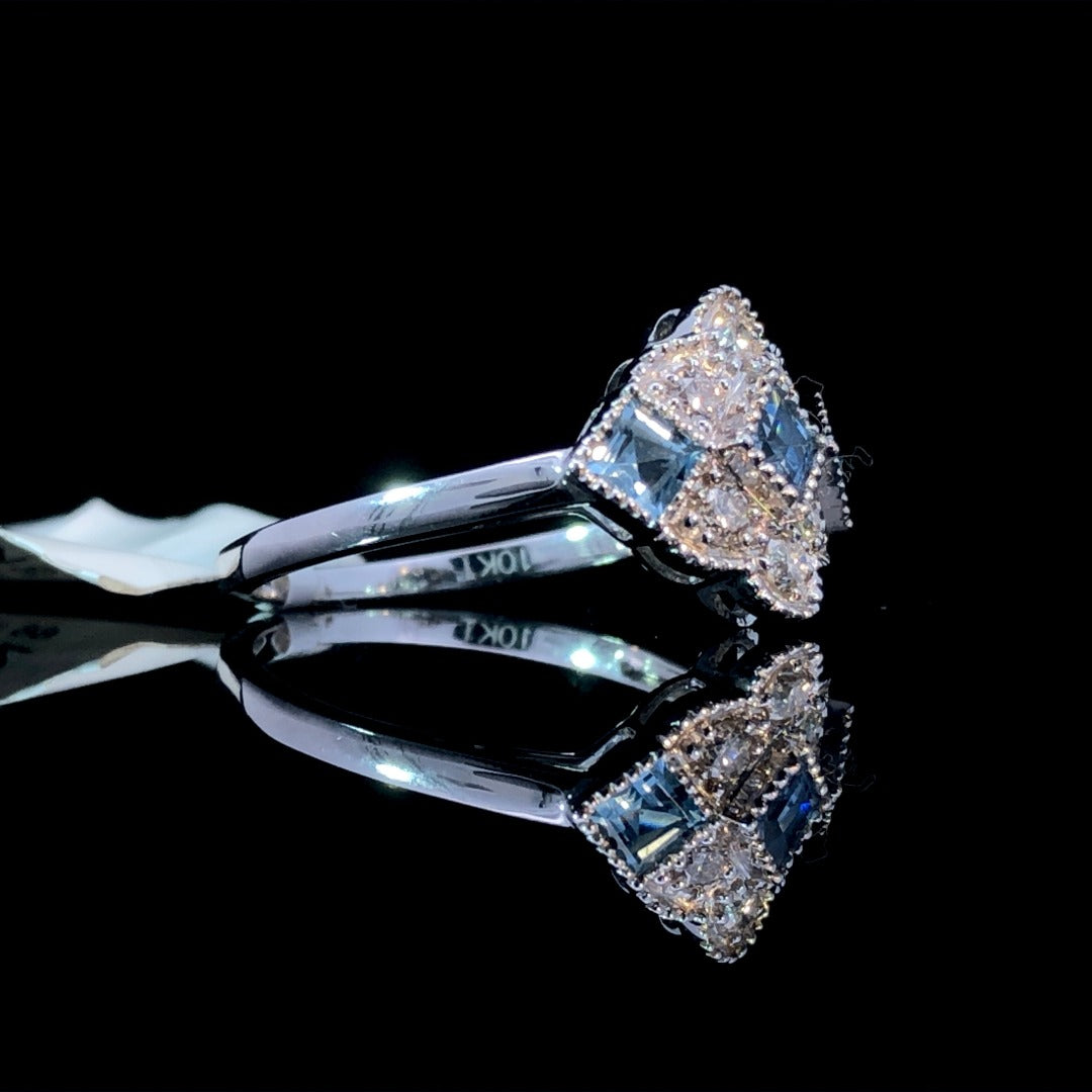 Experience elegance with this beautiful ring! Featuring .67ctw of aquamarines and diamonds set in 10kt white gold, this ring will add a touch of sophistication to any outfit. Make a statement and add a hint of sparkle to your look with this stunning and timeless piece. This ring is a size 6.5. If that size is not a perfect fit, first time sizing is free at the time of purchase. Additional sizing fees may apply.