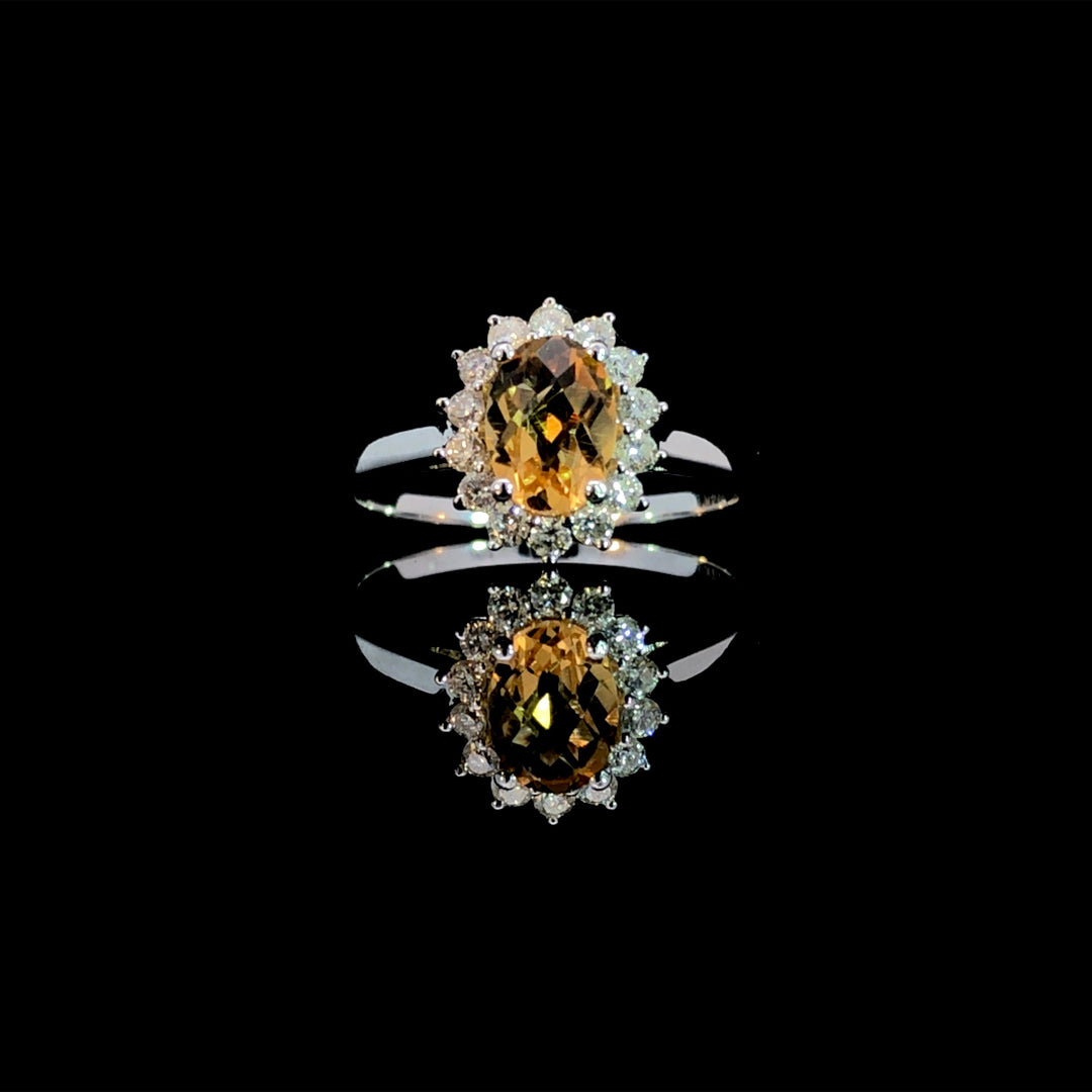 Elevate your look with our stunning ring! Featuring a .75ct oval citrine and a .26ctw round diamond halo set in 14kt white gold, this piece exudes elegance and sophistication. Perfect for any occasion, it's a must-have for anyone who wants to make a statement. This ring is a size 6.5. If that size is not a perfect fit, first time sizing is free at the time of purchase. Additional sizing fees may apply.