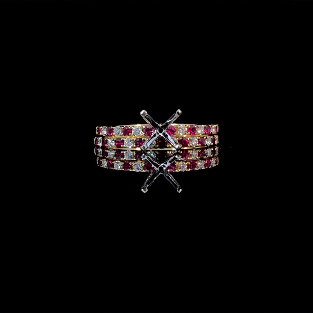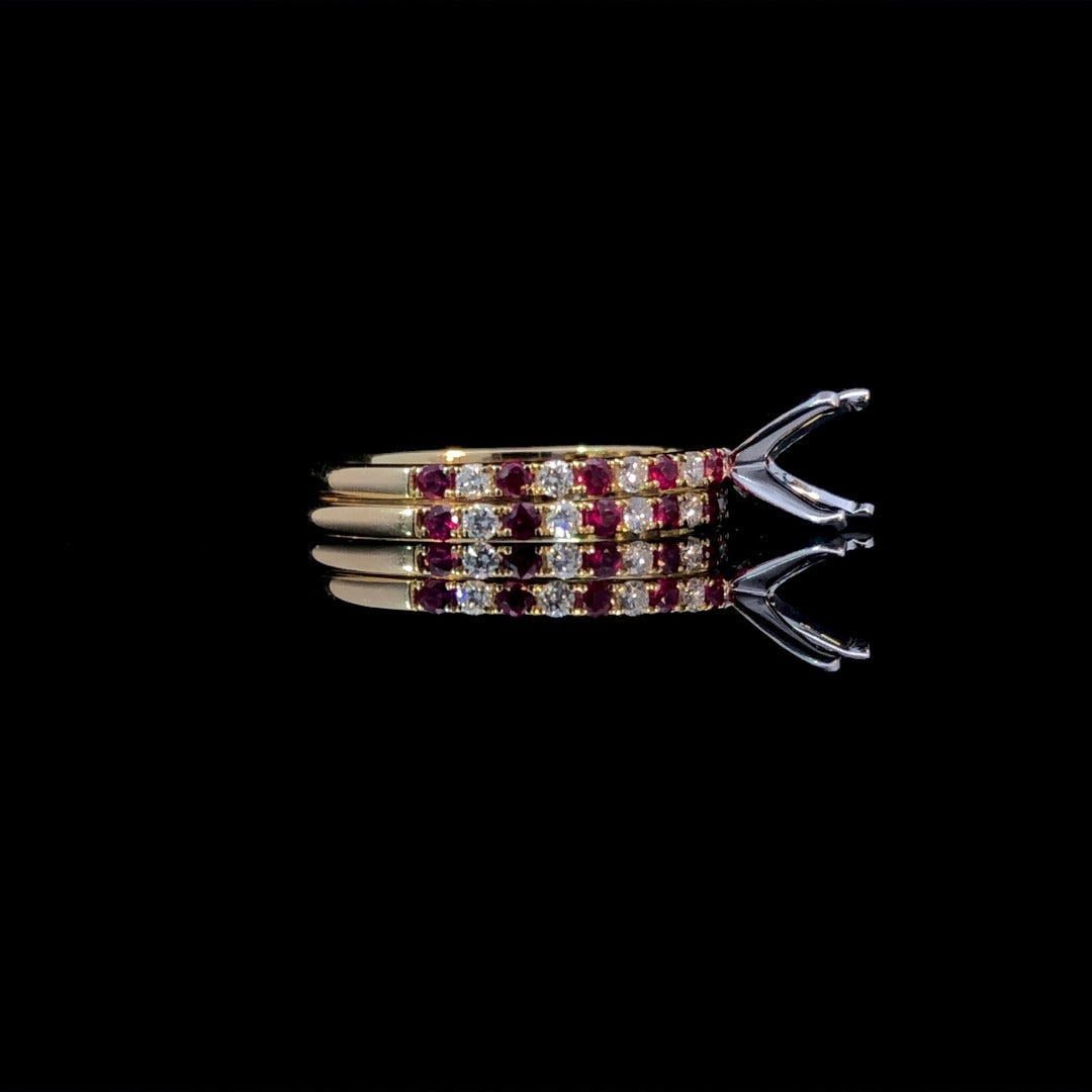 Add a colorful touch to your jewelry collection with our exquisite semi mount. Featuring .33ctw of round rubies and diamonds set in luxurious 14kt yellow gold. Choose your own stone from our selection of loose stones to set at the center, and complete the look with the matching .34ctw band (sold separately). Price is for the semi mount only. Center stone and band will be added at an additional cost. This ring is a size 6. If that size is not a perfect fit, first time sizing is free at the time of purchase. Additional sizing fees may apply.