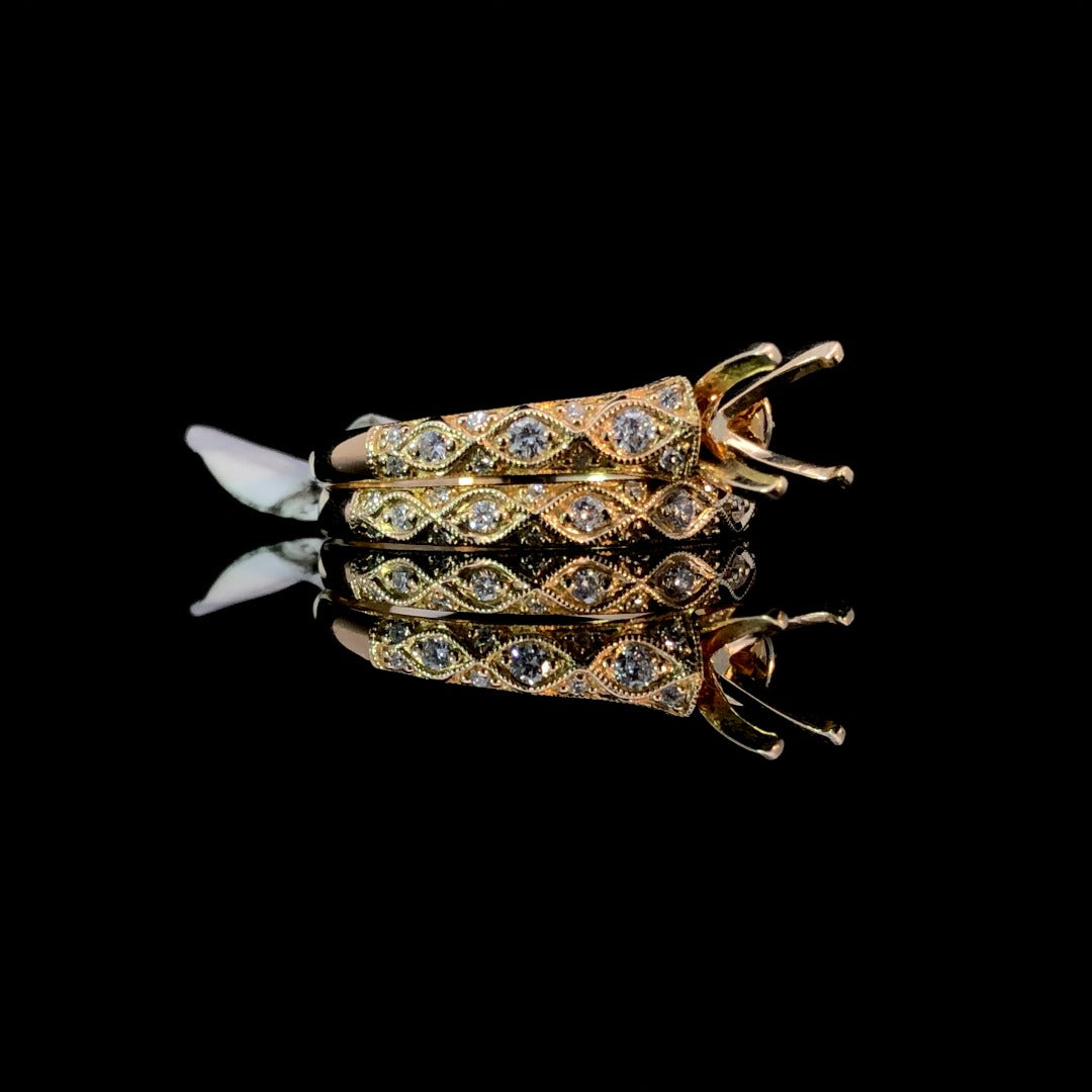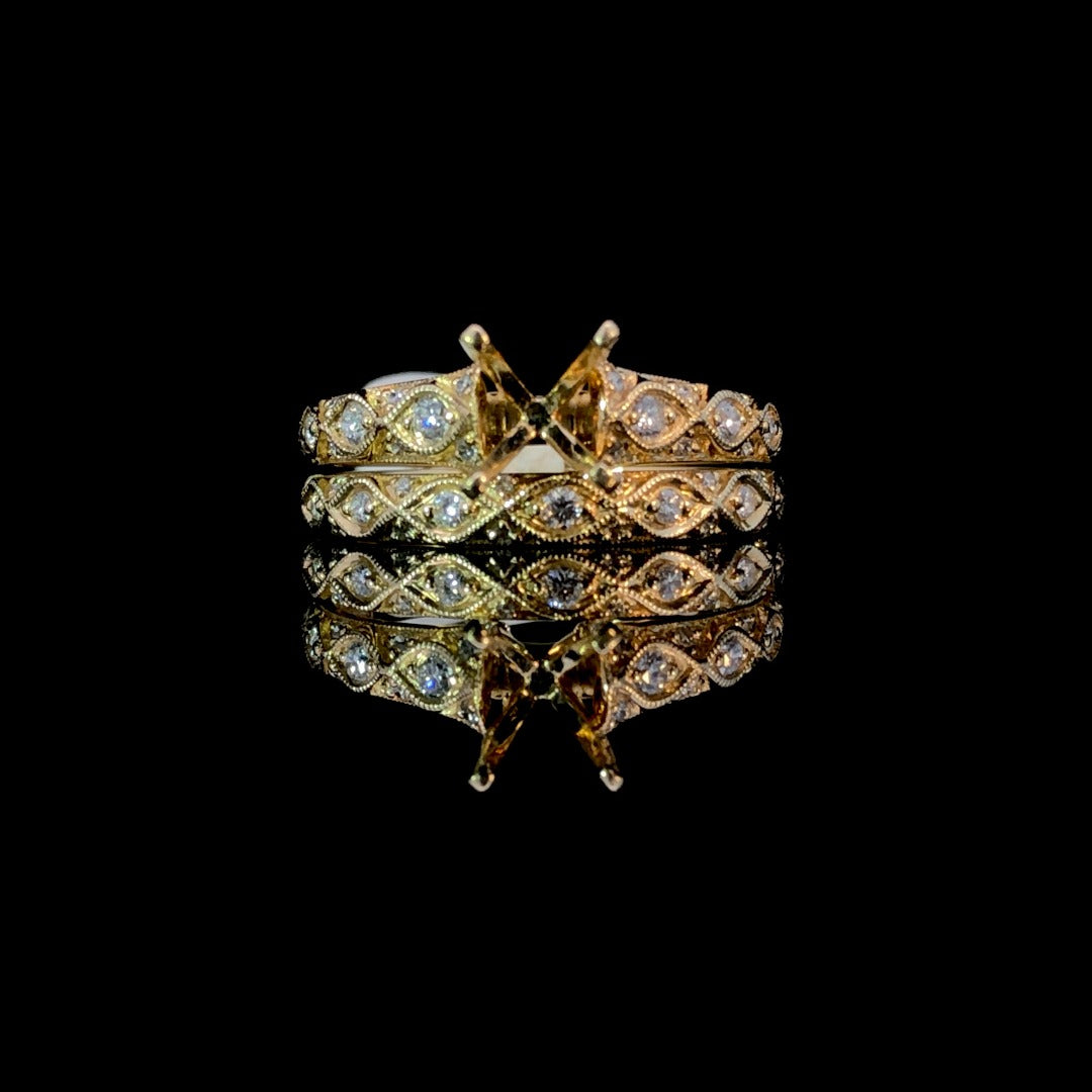 Indulge in luxury with our 14kt yellow gold diamond semi mount. Intricately detailed with milgrain and adorned with .20ctw diamond accents, this ring exudes elegance. Choose your own center stone from our large selection of loose stones. Complete the look with the matching .14ctw diamond band (sold separately). Price is for the semi mount only. Center stone will be added at an additional cost. This ring is a size 6.5. Additional sizing fees may apply.