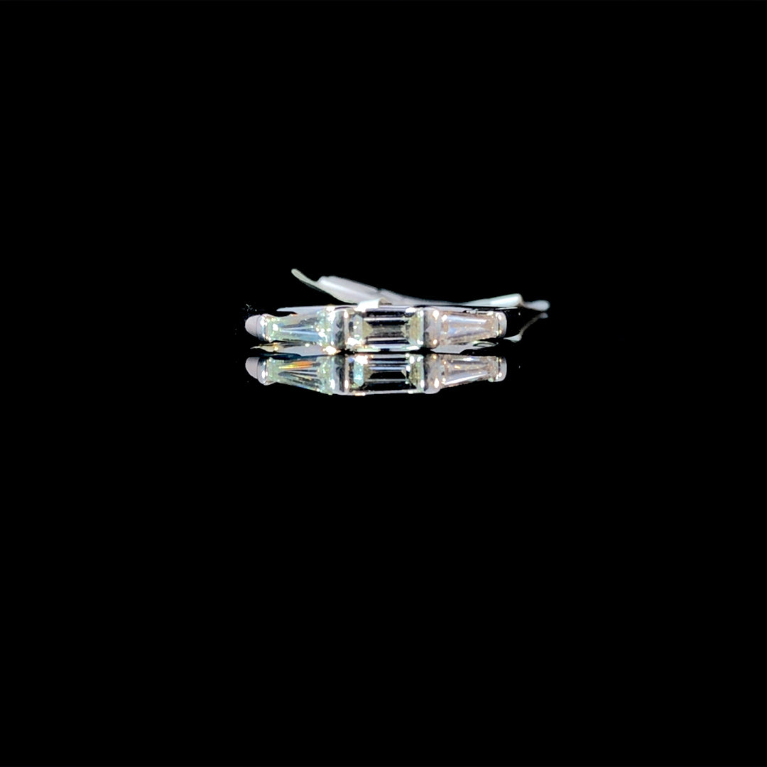 This 14kt white gold band is adorned with 3 sparkling baguette diamonds, totaling .40ctw. Perfect for adding a touch of elegance and shine to any outfit. This ring is a size 6.5. If that size is not a perfect fit, first time sizing is free at the time of purchase. Additional sizing fees may apply.