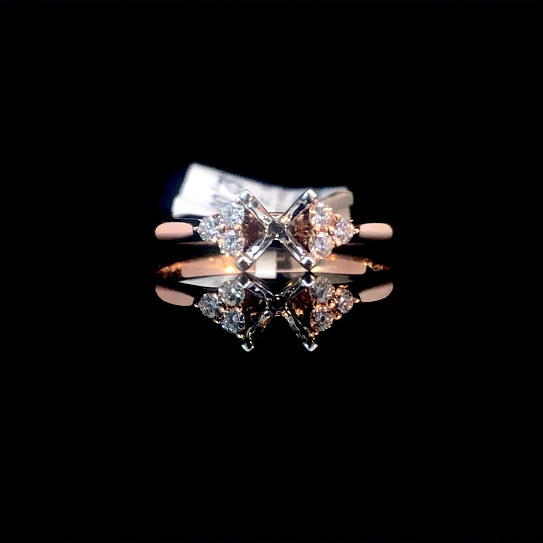 This refined semi-mount ring showcases a timeless design with three round diamonds arranged in a distinctive trillion pattern on each side of the head. Featuring a total diamond weight of 0.13ctw, this rose gold setting offers an elegant foundation for your choice of center stone from our curated collection, allowing you to create a personalized and exquisite piece. Price is for the semi mount only. Center stone will be added at an additional cost. This ring is a size 7. If that size is not a perfect fit, first time sizing is free at the time of purchase. Additional sizing fees may apply.