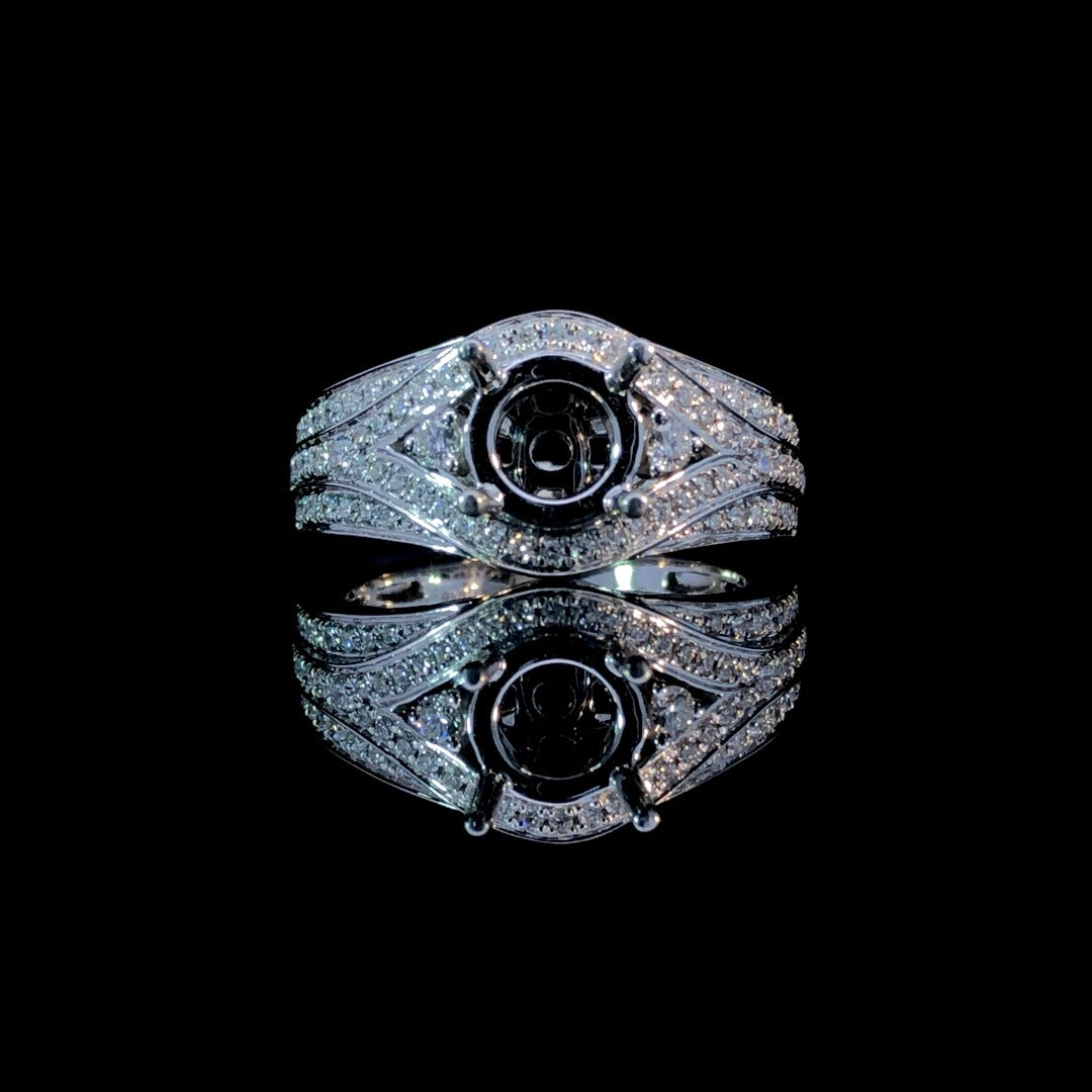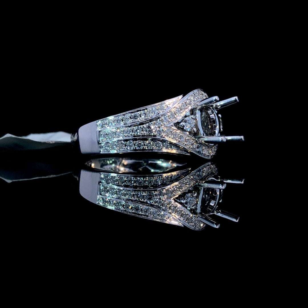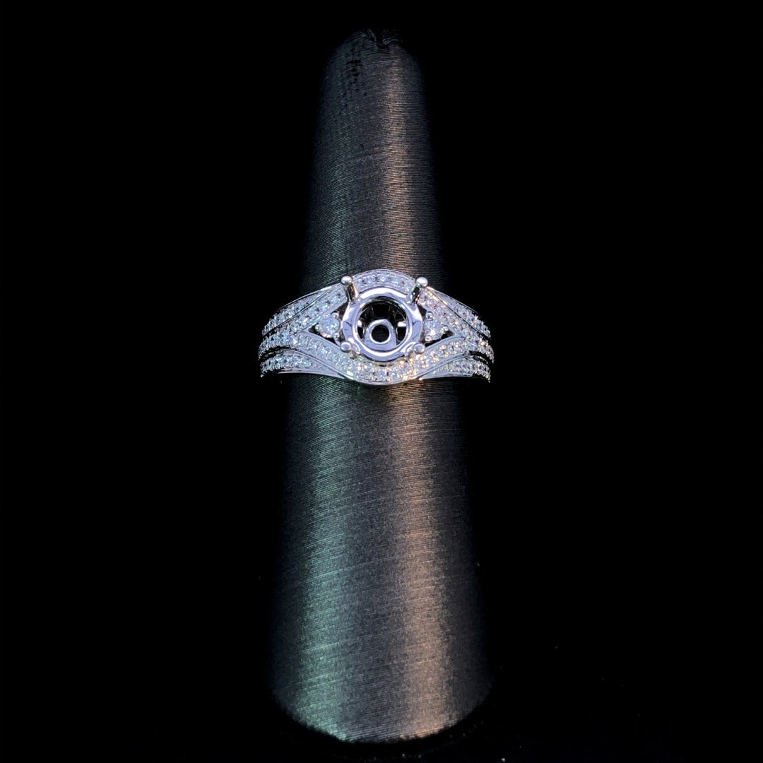 This stunning 14kt white gold semi mount boasts a gorgeous design, featuring .48ctw of sparkling round diamonds. Create a truly unique piece by selecting your own center stone from our unbeatable selection of loose diamonds. Elevate your style with this gorgeous and customizable piece today! Price is for the semi mount only. Center stone will be added at an additional cost. This ring is a size 7. If that size is not a perfect fit, first time sizing is free at the time of purchase. Additional sizing fees may apply.