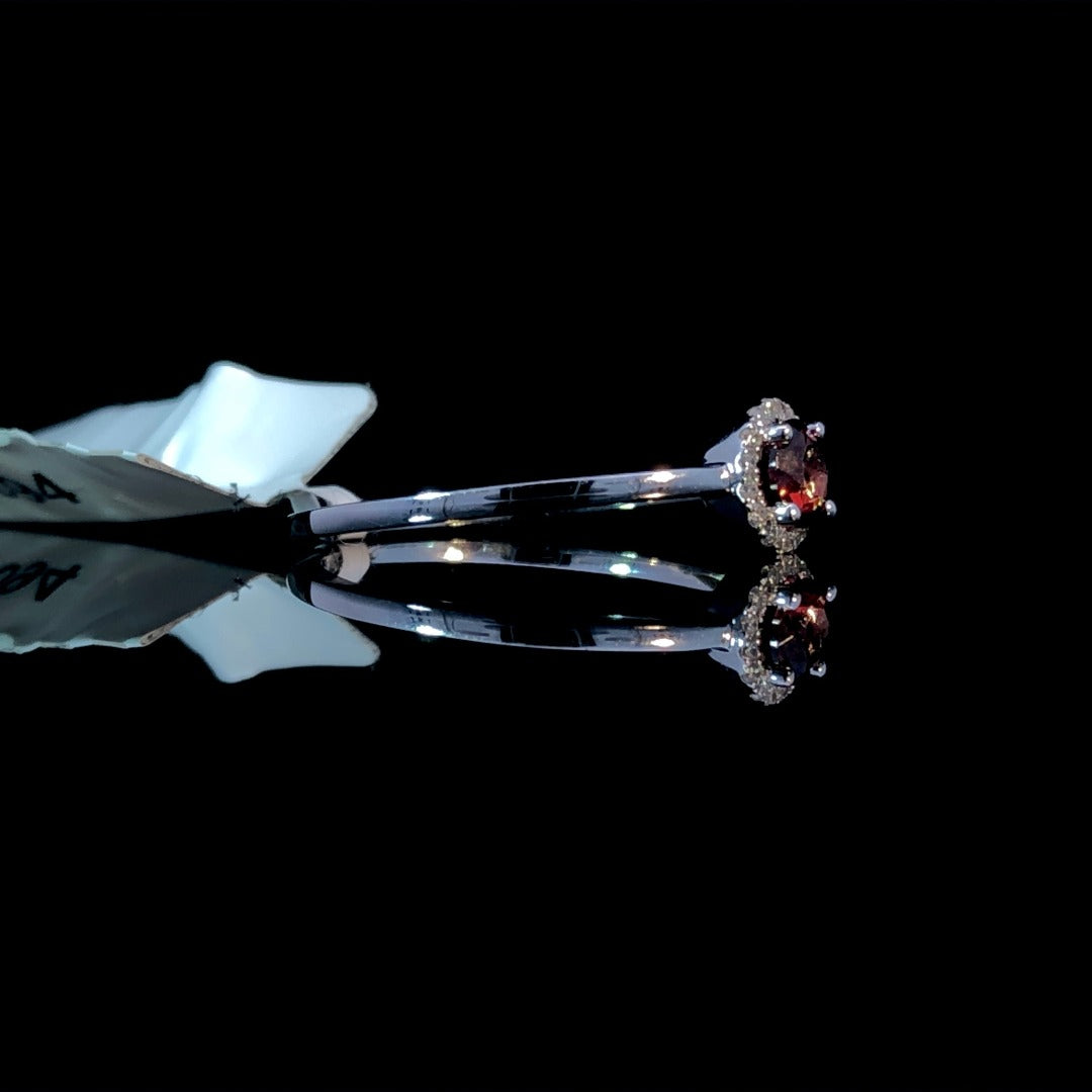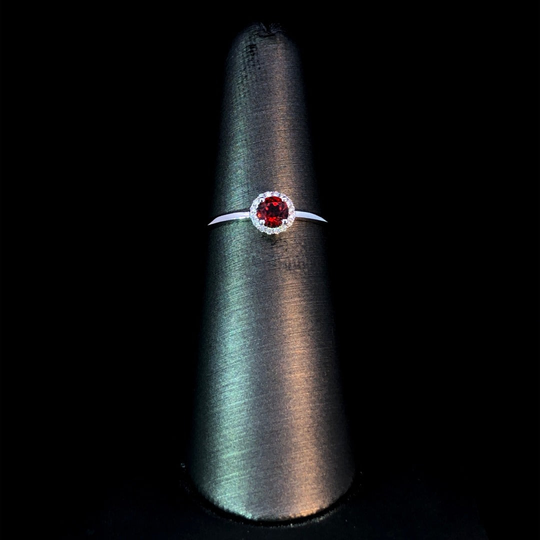 Experience elegance with this 14kt white gold ring featuring a .29ct round garnet center stone surrounded by a .06ctw round diamond halo. Perfect for any occasion, this chic and sophisticated ring adds a touch of glamour to any outfit. This ring is a size 6. If that size is not a perfect fit, first time sizing is free at the time of purchase. Additional sizing fees may apply.